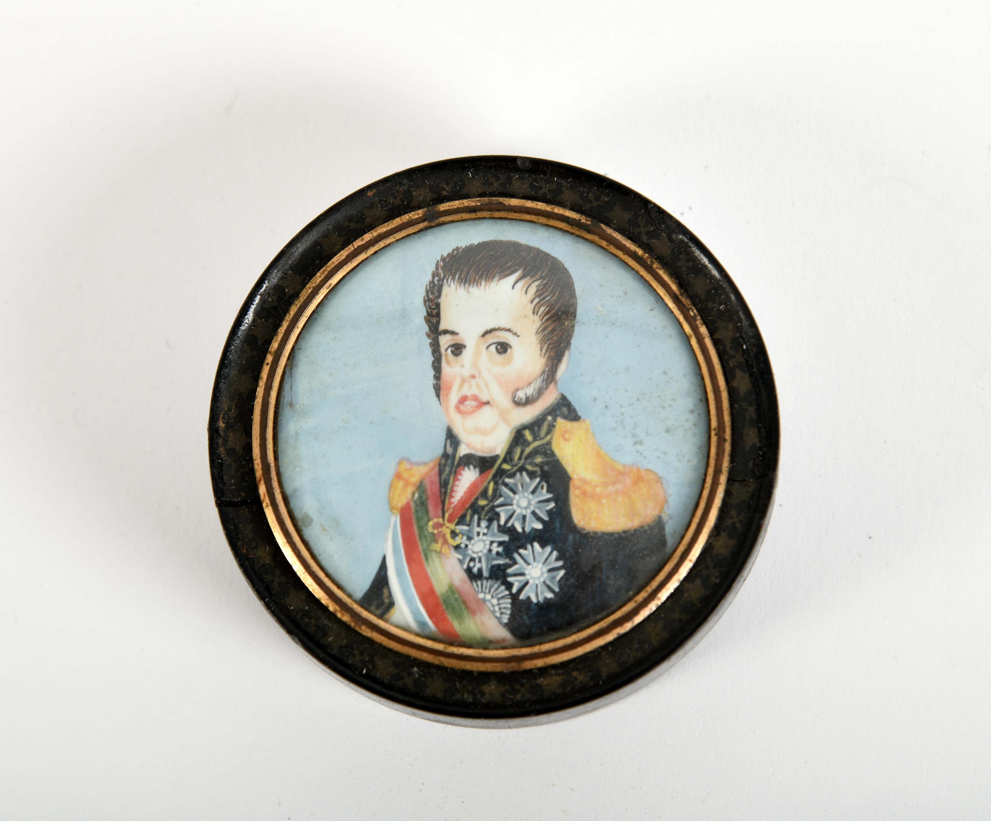 Rei D. João VI (1767-1826) miniatura sobre marfim caixa em tartaruga envernizada e pintada "Estrelas", aro em metal dourado escola Portuguesa séc. XIX (1º quartel) restauros na pintura, fissuras na caixa Dimensões (altura x comprimento x largura) - 2,5 x 7 cm Notas: a) Este lote está sujeito às restrições CITES de exportação/importação e encontra-se devidamente certificado: nº 25PTLX04482C;b) É actualmente proibida por diversos países a importação de bens que incorporem materiais de espécies da fauna e flora selvagens protegidas, incluindo, entre outros, marfim, coral e tartaruga;c) Em Portugal, em conformidade com a prevista transposição para a legislação nacional das mais recentes orientações da UE relativas ao comércio de marfim, está suspensa a emissão de certificados de reexportação para países que não integrem a UE;d) Neste contexto, aconselham-se os seus potenciais compradores a informarem-se previamente sobre a legislação do seu país e restrições internacionais aplicáveis.
