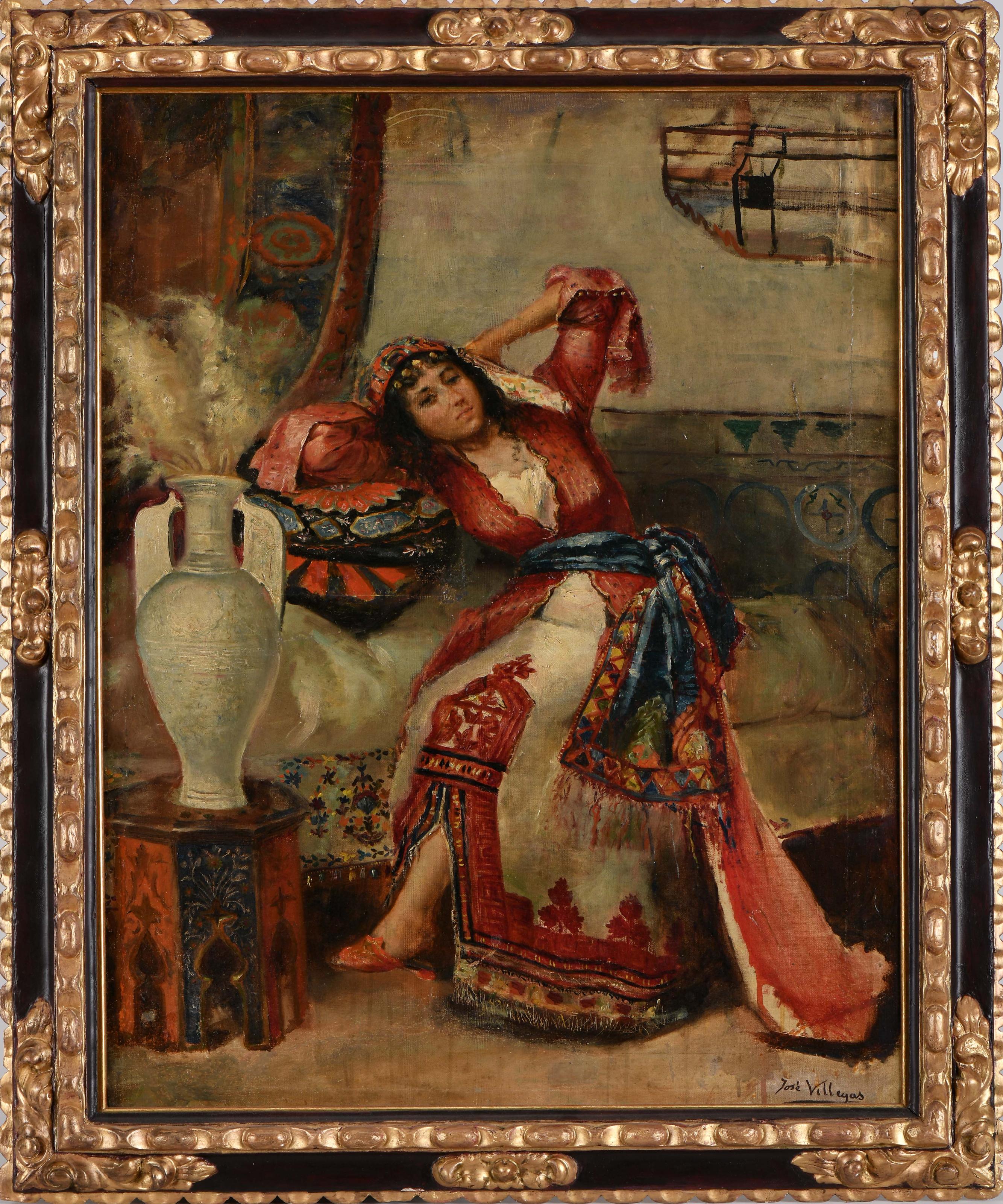 "La Odalisca" óleo sobre tela ao gosto orientalista escola Espanhola séc. XIX (2ª metade) reentelado, pequenos restauros assinado JOSÉ VILLEGAS - provavelmente José Villegas Cordero (1844/48-1921) Dimensões (altura x comprimento x largura) - 85 x 62,5 cm Notas: verso com etiqueta identificando o autor, a obra e um anterior proprietário