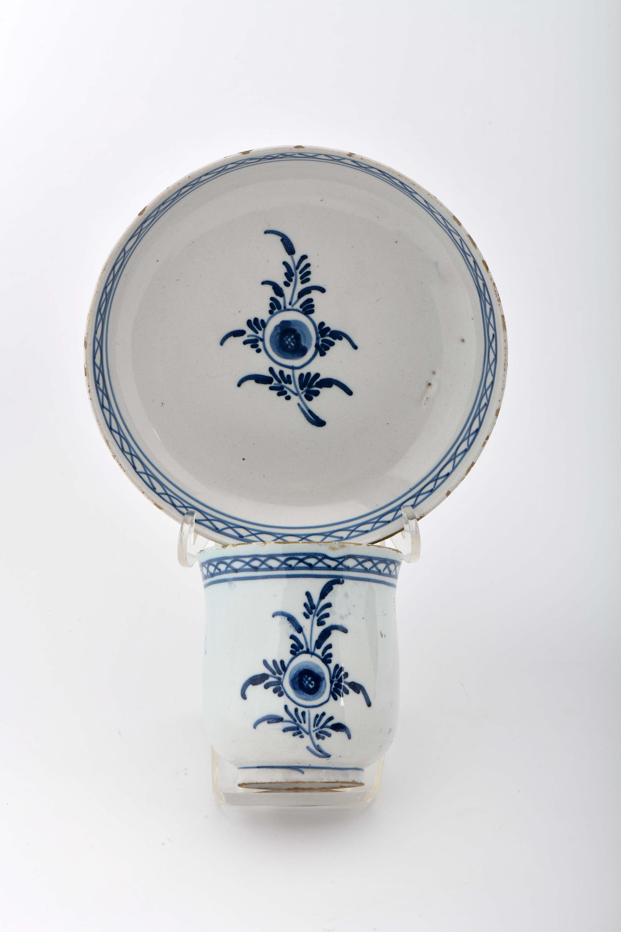 Chávena com pires faiança possivelmente da Real Fábrica de Louça, ao Rato sob a direcção de Sebastião de Almeida (1771-1779) decoração a azul "Ramo de flores" Portugueses séc. XVIII (2ª metade) ínfimas esbeiçadelas, faltas no vidrado dos bordos Dimensões (altura x comprimento x largura) - (chávena) 7,5 x 7 cm; (pires) 13,6 cm Notas: vd. catálogo da exposição "Real Fábrica de Louça, ao Rato". Lisboa: Instituto Português de Museus, 2003, pp. 282-307.