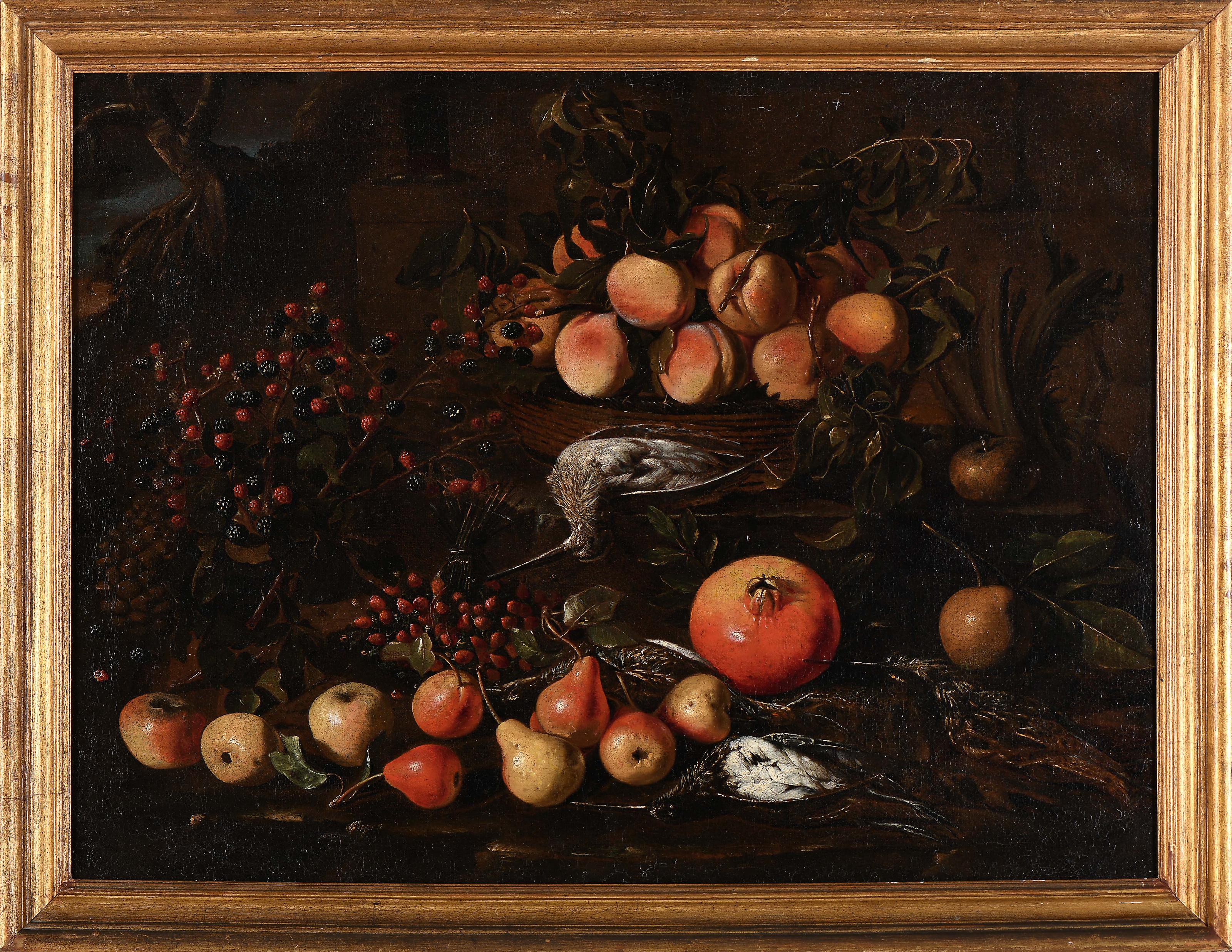 Natureza morta - Romã, pêssegos, peras, bagas e caça óleo sobre tela escola Europeia séc. XVII (2º quartel) reentelado, ligeiros restauros Dimensões (altura x comprimento x largura) - 72 x 94,5 cm Notas: a presente pintura integrou o leilão "Old Masters" realizado a 16-6-2022 pela Christie's, Nova Iorque, onde se encontra atribuída ao mestre SB (act. 1620-c. 1655) - vd. https://onlineonly.christies.com/s/old-masters-no-reserves/master-sb-active-rome-c-1620-c-1655-naples-38/154368?sc_lang=en - consultado a 02-3-2026 às 11:39.
