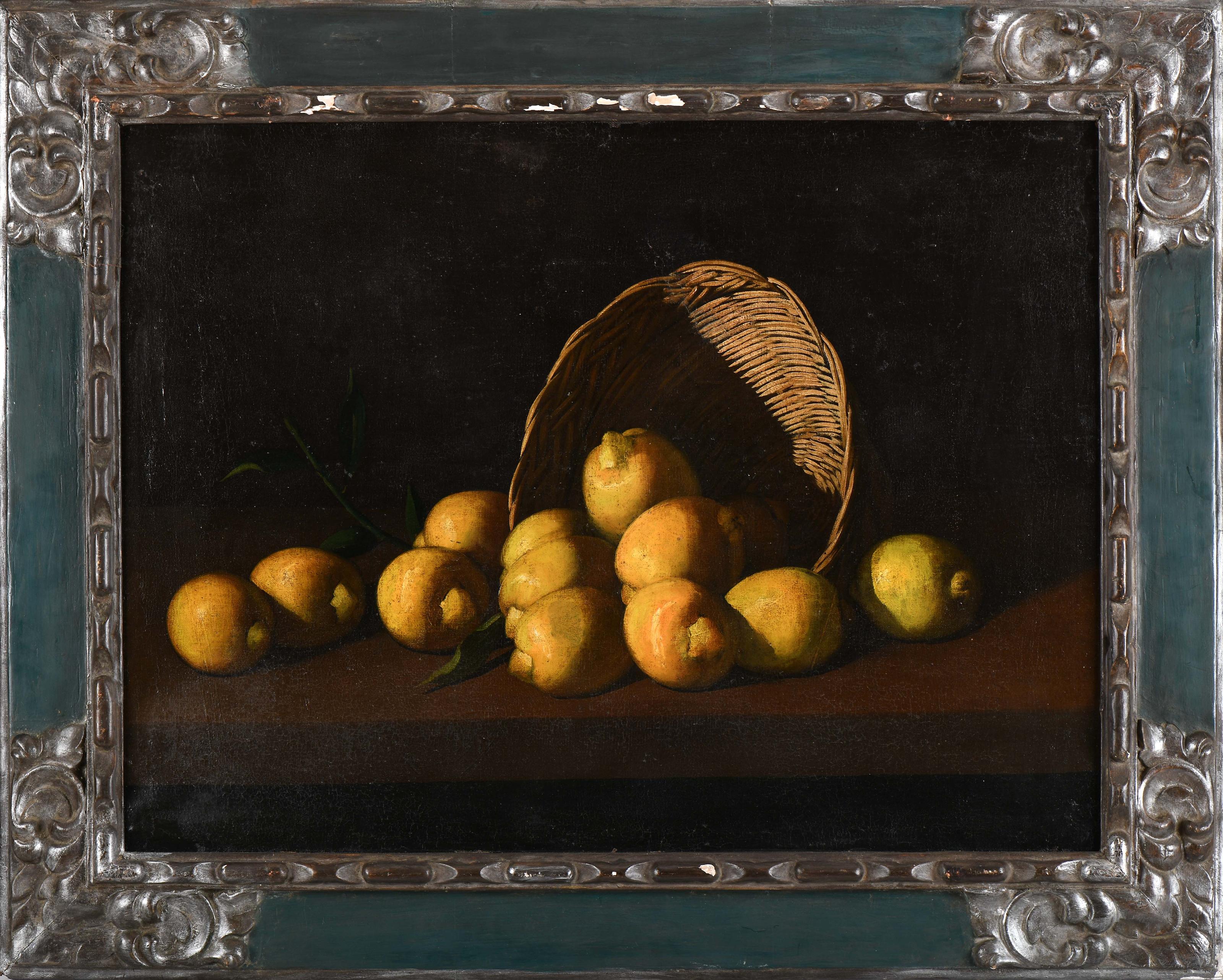 Cesto com limões óleo sobre tela escola Espanhola séc. XVIII reentelado, restauros Dimensões (altura x comprimento x largura) - 61 x 82,5 cm