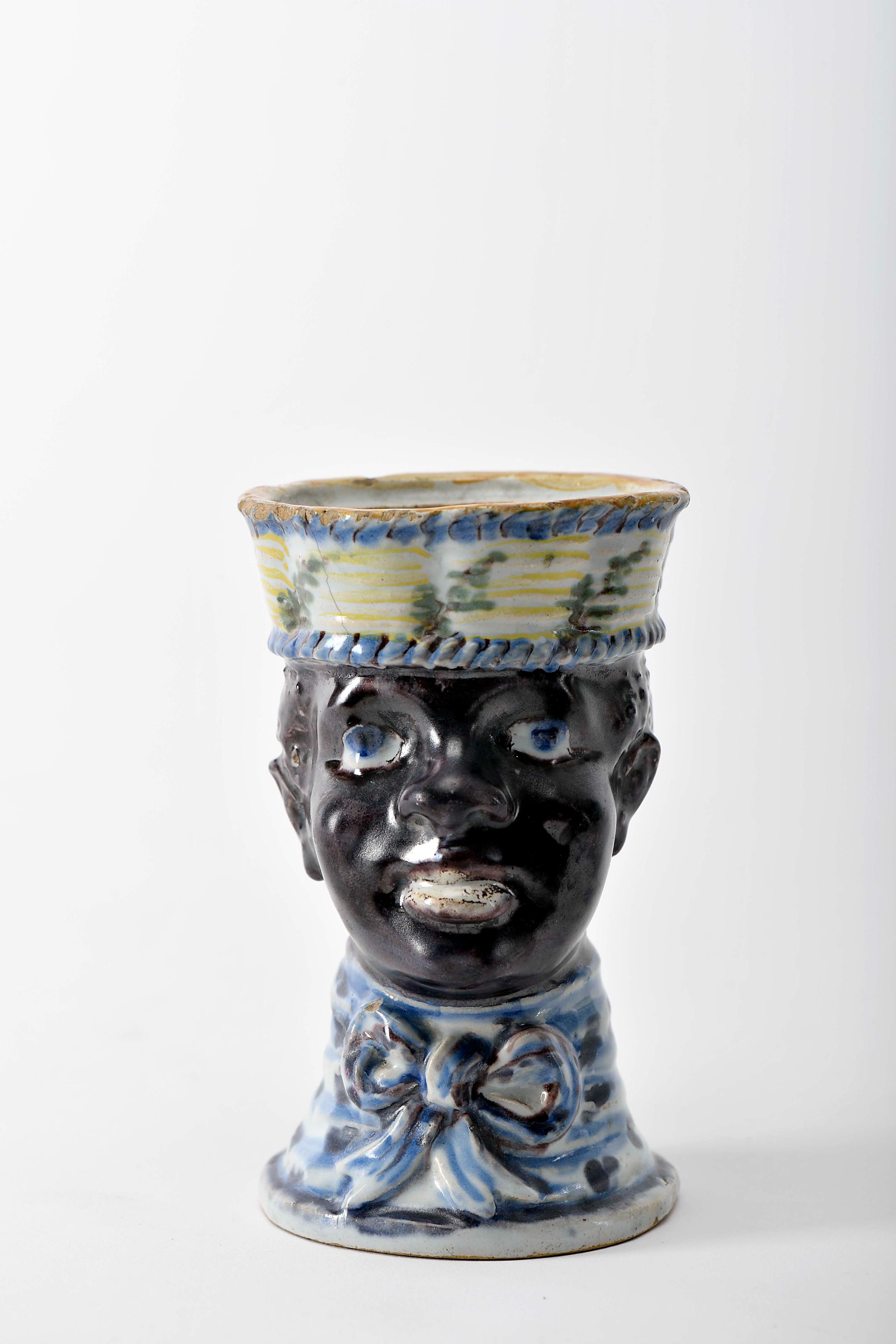 Caneca "Cabeça de negra" faiança da Real Fábrica de Louça, ao Rato decoração policromada Portuguesa séc. XVIII/XIX restauro na pega, pequeno cabelo, esbeiçadelas, pequenas faltas no vidrado Dimensões (altura x comprimento x largura) - 12,5 cm Notas: exemplar semelhante integrou a exposição "Real Fábrica de Louça, ao Rato", Museu Nacional do Azulejo/ Museu Nacional de Soares dos Reis, Lisboa e Porto, 2003, encontrando-se representado no respectivo catálogo, p. 407, nº 185. Outro exemplar idêntico integrou a Colecção António Capucho, encontrando-se representado em ARRUDA, Luísa d`Orey Capucho; HENRIQUES, Paulo; PAIS, Alexandre Nobre; e MONTEIRO, João Paulo - "António Capucho; retrato do homem através da colecção - cerâmica portuguesa do século XVI ao século XX", Livraria Civilização Editora, Porto, p. 111, nº 51.