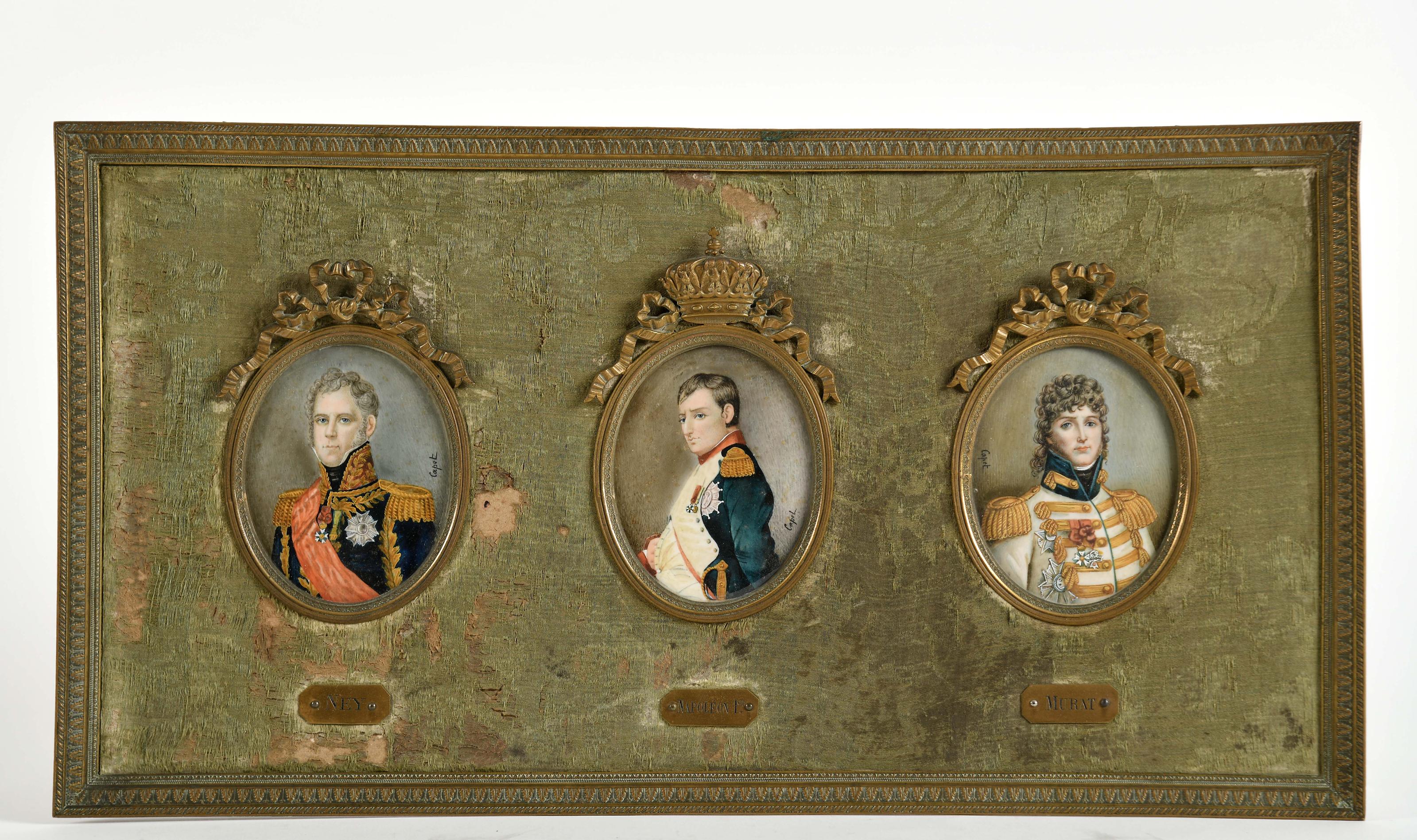 Retratos de Napoleão (1769-1821) e dos marechais Ney (1769-1815), e Murat (1767-1815) três miniaturas sobre marfim emolduradas conjuntamente molduras em metal amarelo relevado com passepartout de seda verde escola Francesa séc. XIX seda em mau estado assinadas CAPET Dimensões (altura x comprimento x largura) - (miniaturas) 9 x 7 cm; (moldura) 23,5 x 44,5 cm Notas: a) Este lote está sujeito às restrições CITES de exportação/importação e encontra-se devidamente certificado: nº 26PTLX00658C;b) É actualmente proibida por diversos países a importação de bens que incorporem materiais de espécies da fauna e flora selvagens protegidas, incluindo, entre outros, marfim, coral e tartaruga;c) Em Portugal, em conformidade com a prevista transposição para a legislação nacional das mais recentes orientações da UE relativas ao comércio de marfim, está suspensa a emissão de certificados de reexportação para países que não integrem a UE;d) Neste contexto, aconselham-se os seus potenciais compradores a informarem-se previamente sobre a legislação do seu país e restrições internacionais aplicáveis.