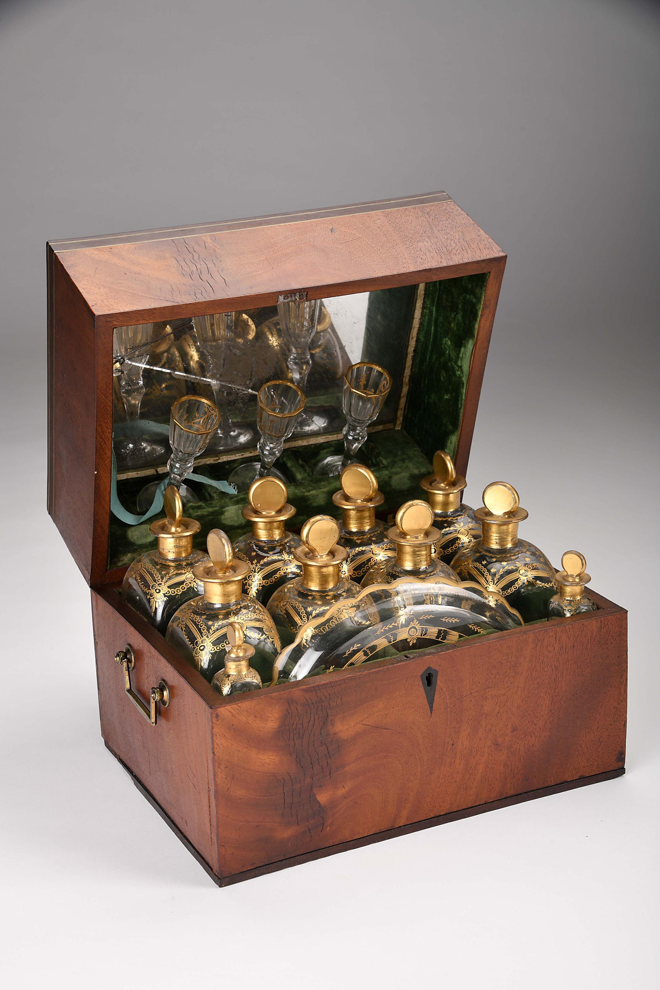 Licoreiro Jorge IV (1820-1830) estojo em mogno e folheado de mogno com filetes embutidos em latão e pegas de metal interior revestido a veludo verde com fundo da tampa em espelho e oito frascos, dois frascos tubulares, bandeja e três cálices em vidro com decoração a dourado Inglês estojo com pequenas faltas e defeitos, espelho do interior partido, um frasco tubular com falta no gargalo Dimensões (altura x comprimento x largura) - (estojo) 22 x 30 x 22,2 cm; (frasco) 18,2 cm