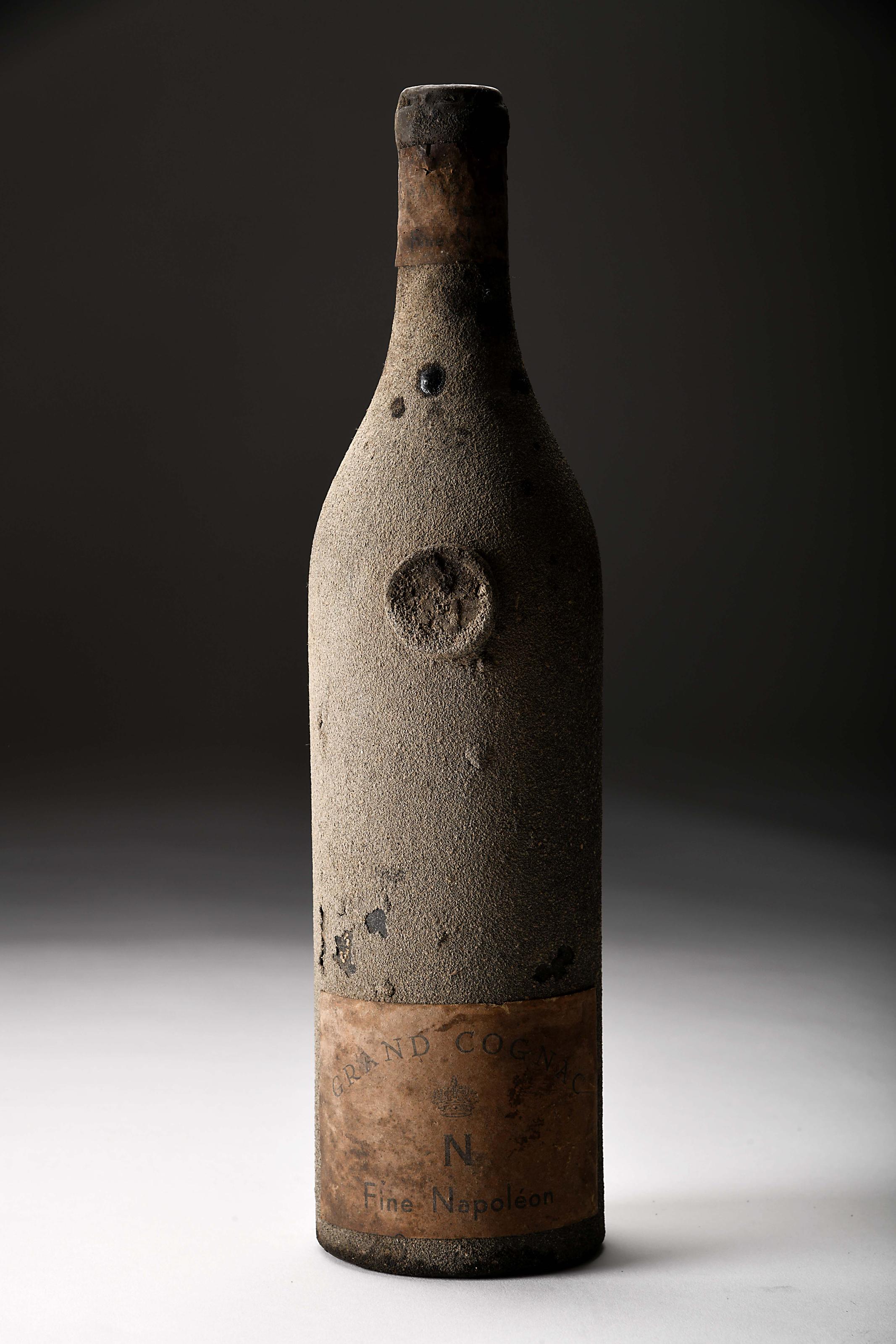 Grand Cognac Fine Napoléon Fine Champagne 1811 Cognac garrafa com areia aderente ao vidro, marca N coroada no próprio vidro e no rótulo; cápsula de estanho com marcação legível: Napoléon 1811, rd (rótulo e gargantilha naturalmente manchados danificado); com gargantilha, nível: 8 cm abaixo do topo da marisa