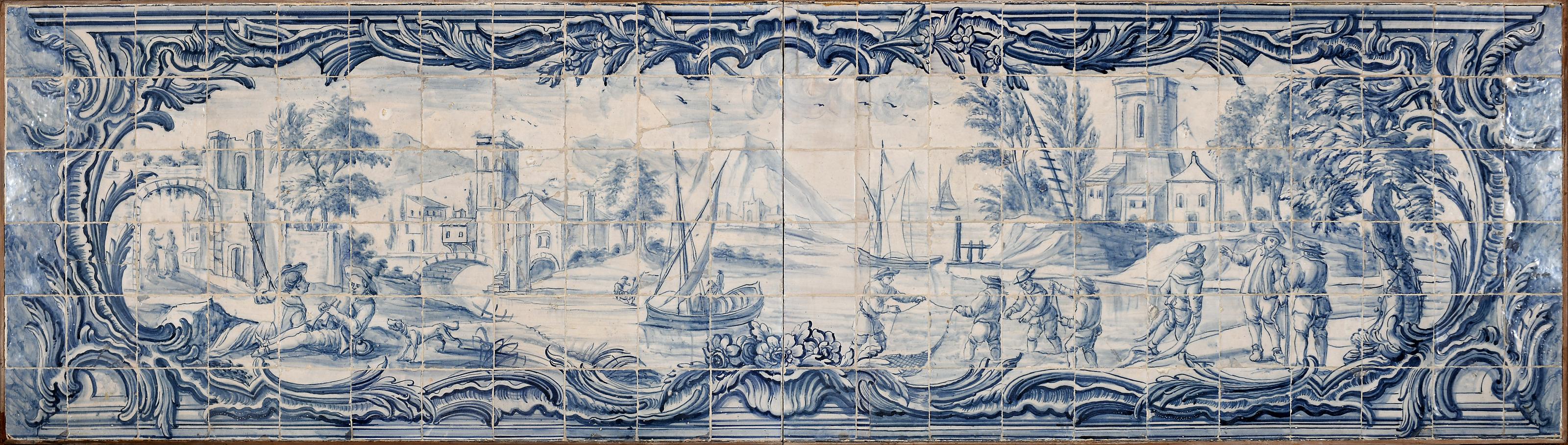 Vista de porto com barcos e figuras D. José (1750-1777) painel composto por 132 azulejos decoração a azul Português restauros, alguns partidos e colados Dimensões (altura x comprimento x largura) - 86 x 306 cm