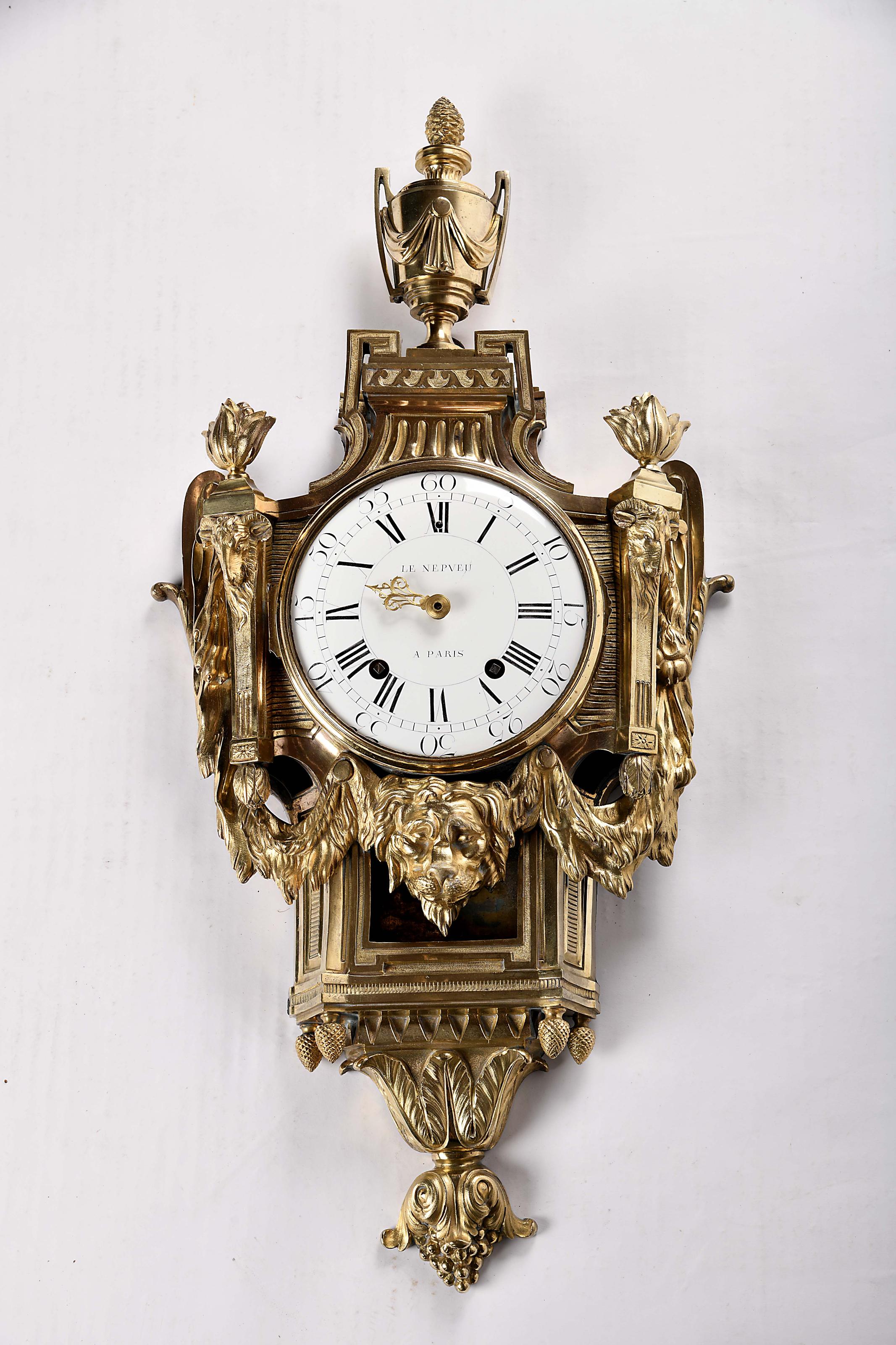 Relógio de parede - «cartel clock» Luís XVI (1774-1791) bronze relevado e dourado mostrador em esmalte com numeração romana e árabe a negro, autonomia de oito dias, regulação da marcha no mostrador, toca horas e meias horas em campainha Francês falta do ponteiro dos minutos, do vidro do mostrador e da chave, redourado, defeitos no esmalte, oxidação, mecanismo a necessitar de revisão mostrador marcado LE NEPVEU - A PARIS Dimensões (altura x comprimento x largura) - 85,5 x 41 x 11 cm