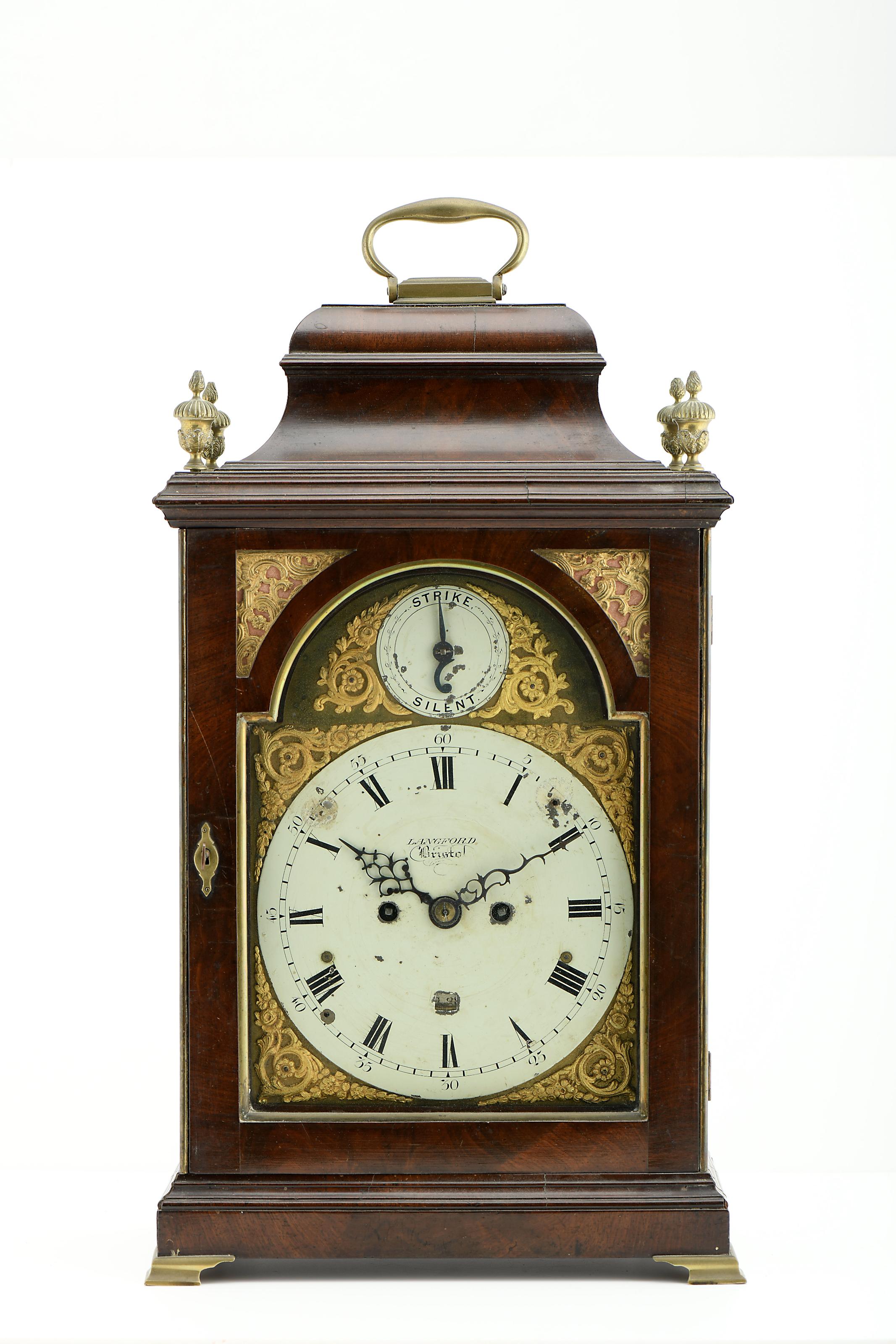 Relógio de mesa Jorge III (1760-1820) caixa em carvalho folheada a mogno, pináculos, frisos, pés, pega e outras aplicações em latão mostrador em latão pintado no centro e com aplicações de latão vazado, numeração romana e árabe a negro, calendário mensal, autonomia de oito dias, toca horas e meias horas em campainha, escape de âncora, platina traseira com decoração gravada Inglês séc. XVIII/XIX faltas no esmalte, outras pequenas faltas e defeitos, vestígios de insectos xilófagos, mecanismo a necessitar de revisão mostrador marcado LANGFORD - BRISTOL Dimensões (altura x comprimento x largura) - 55 x 30,6 x 18,5 cm