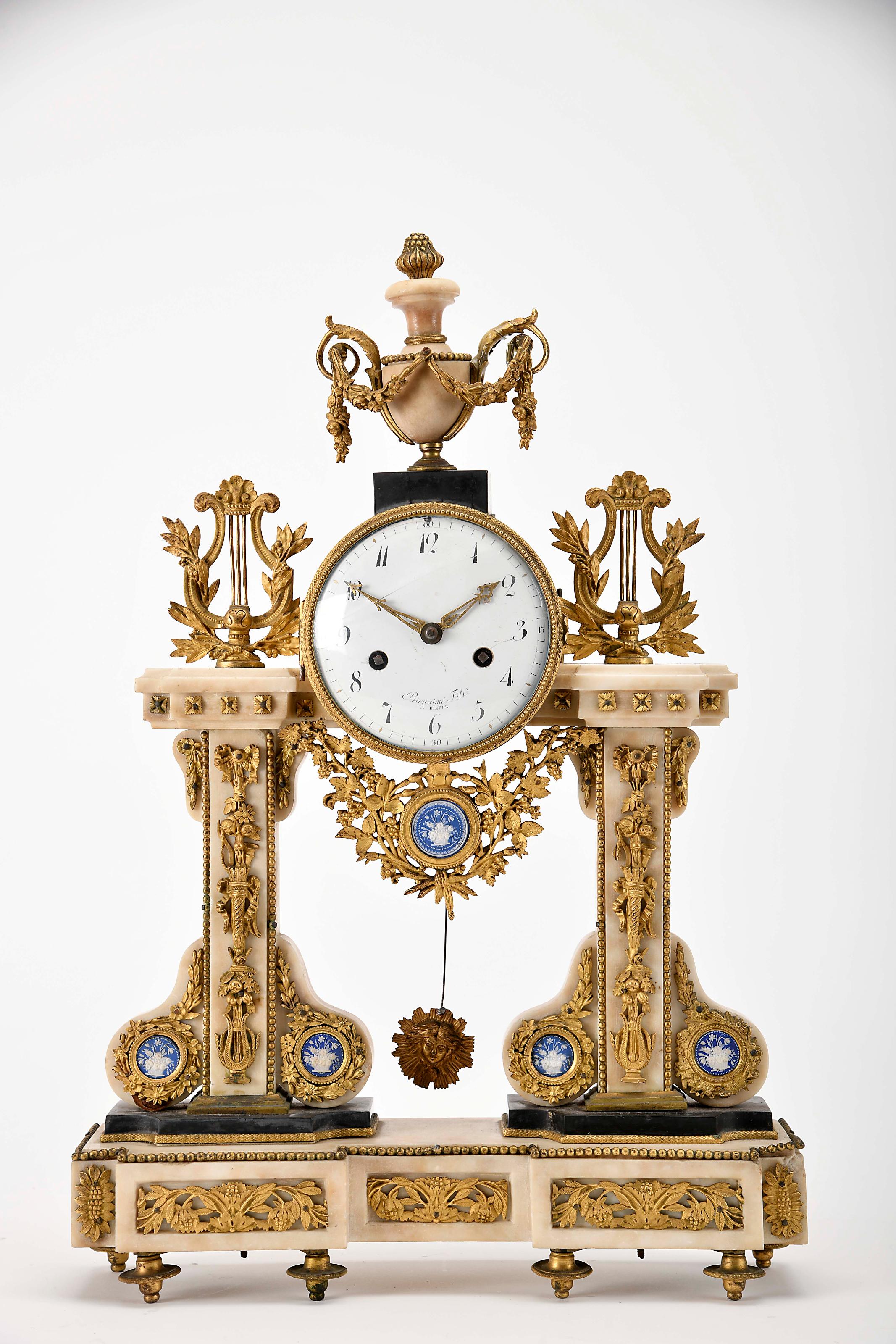 Relógio de mesa "Urna e liras" Luís XVI (1774-1791) mármore, bronze dourado, latão, aço e vidro, medalhões em biscuit "Cestos de flores" mostrador em esmalte branco com numeração árabe a negro, autonomia de oito dias, toca horas e meias horas em campainha, regulação da marcha no mostrador Francês vidro fissurado, esbeiçadela no mármore e amolgadela no bronze, mecanismo a necessitar de revisão mostrador marcado BIENAIMÉ FILS À DIEPPE Dimensões (altura x comprimento x largura) - 54 x 37 x 10,5 cm