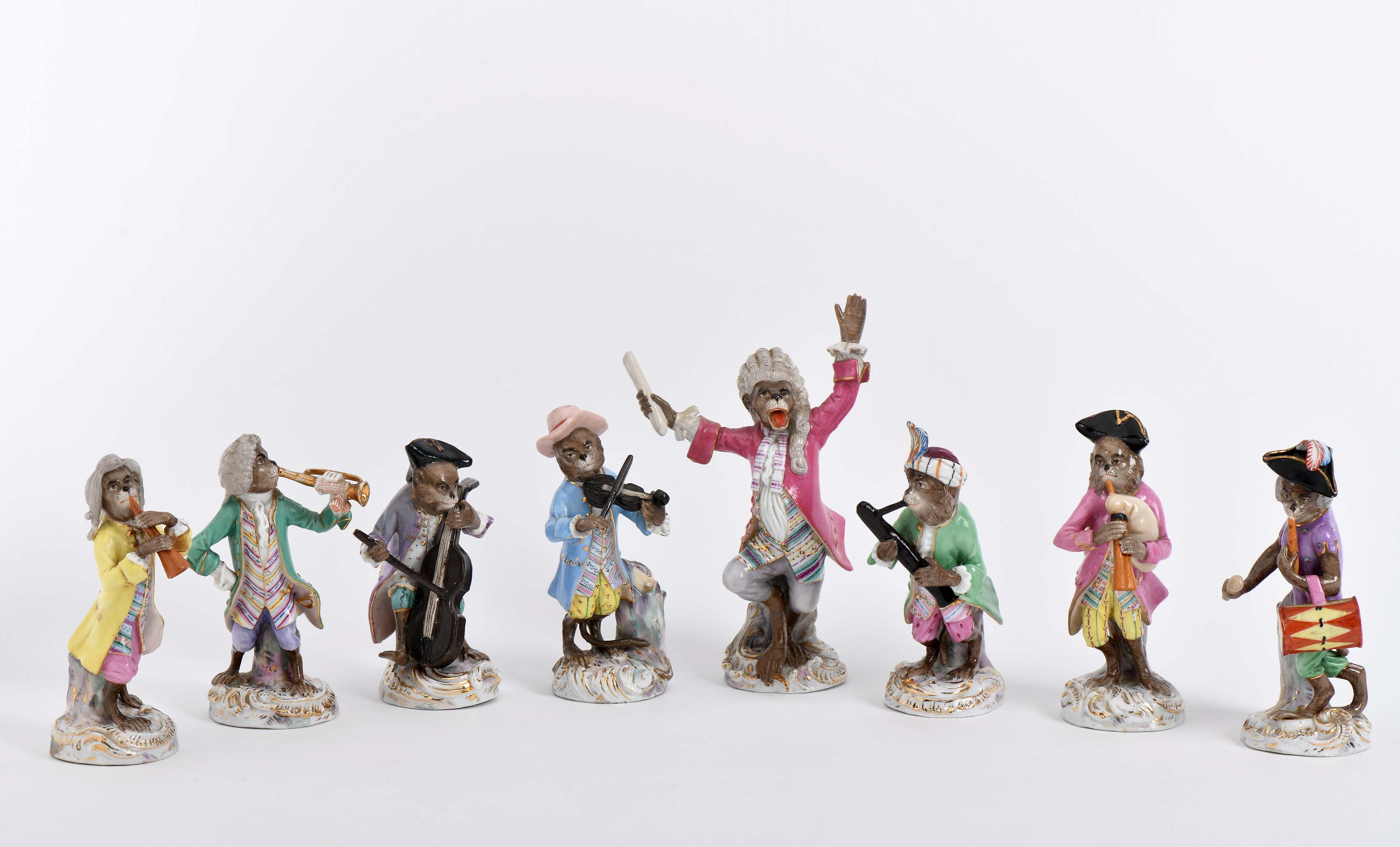 Orquestra de macacos conjunto de oito esculturas em porcelana da Kranichfelder Porzellane Manufackture (Saxónia) decoração policromada Alemãs séc. XIX (2ª metade) restauros, pequenas faltas alguns marcados Dimensões (altura x comprimento x largura) - (maestro) 19 cm