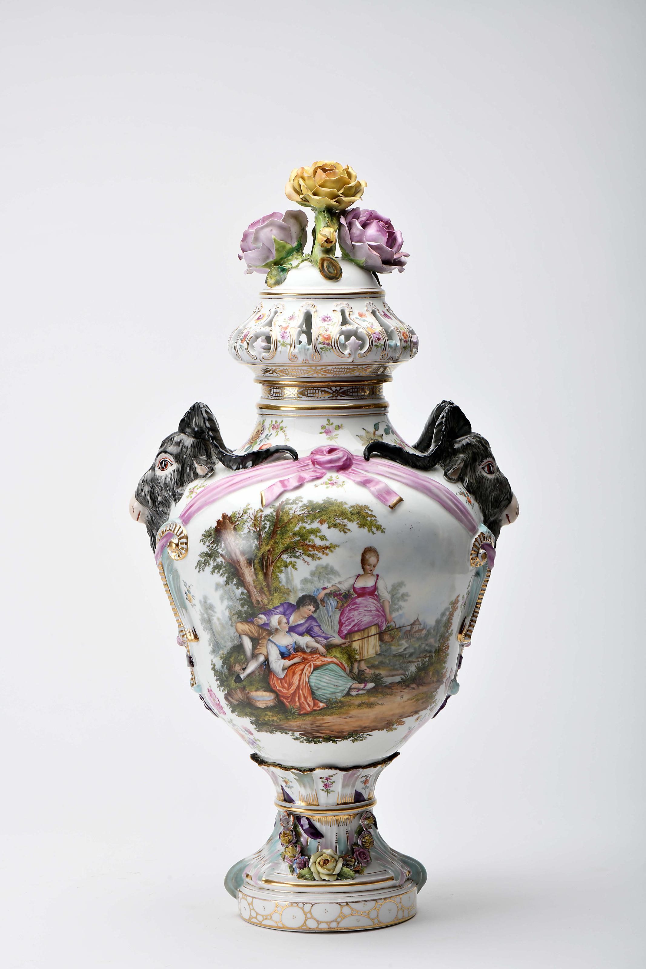 Pote de grandes dimensões com tampa porcelana de Carl Thime - Saxónia decoração relevada e policromada "Flores", reservas centrais "Cenas galantes" Alemão séc. XIX (2ª metade) pequenos restauros, cabelo no corpo, pequenas faltas e esbeiçadelas marcado Dimensões (altura x comprimento x largura) - 68 cm