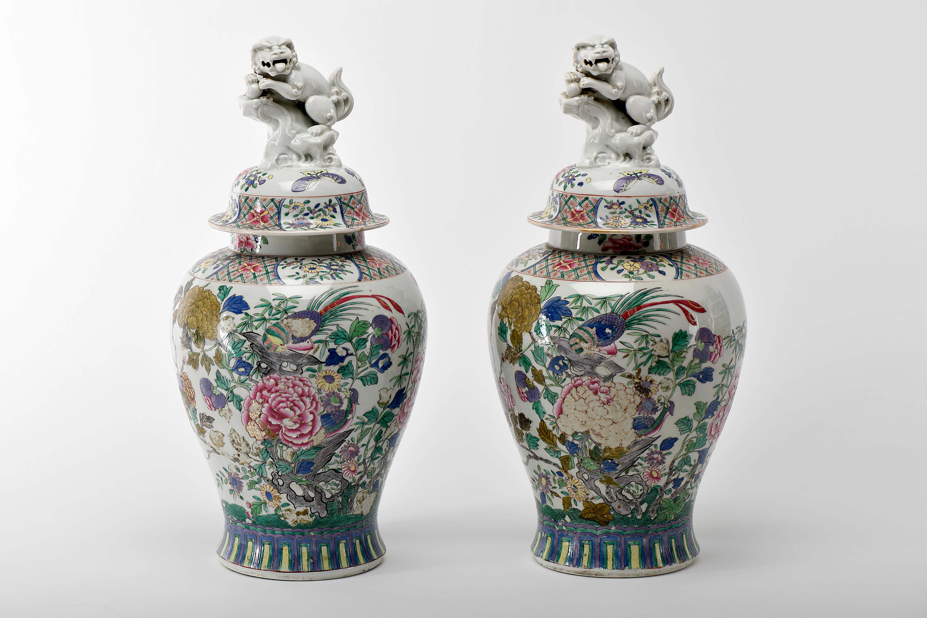 Par de potes com tampa porcelana provavelmente da Fábrica de Sanson decoração policromada ao gosto das porcelanas chinesas de exportação "Aves, borboletas e flores", pomos das tampas esculpidos "Leão budista" Franceses séc. XIX restauros e desgaste na decoração Dimensões (altura x comprimento x largura) - 54 cm