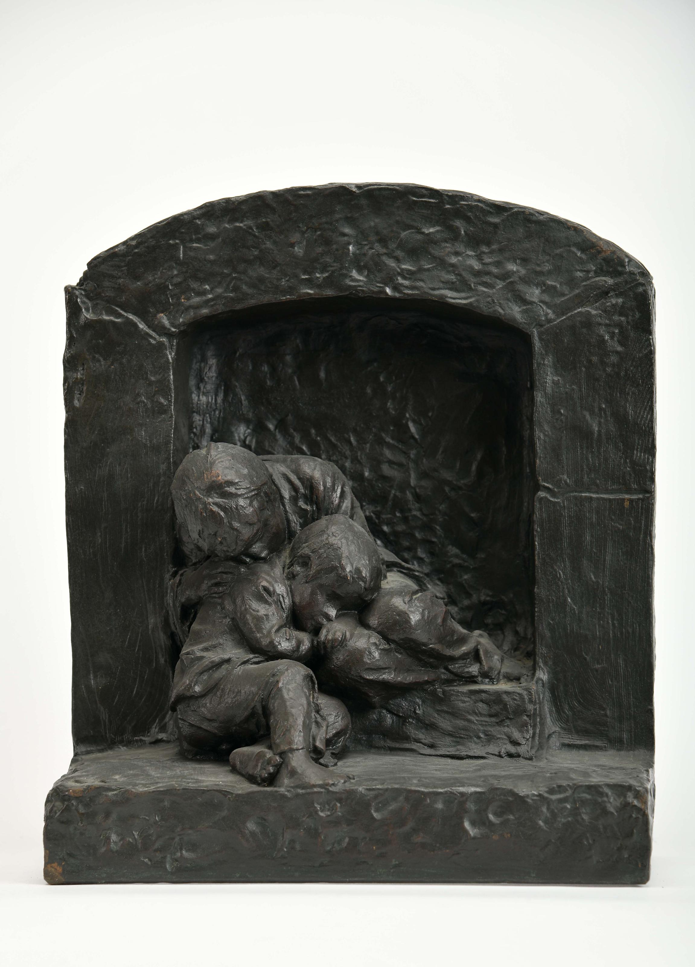 ANTÓNIO TEIXEIRA LOPES - 1866-1942 Crianças sem-abrigo escultura em bronze assinada e datada de 1912 Dimensões (altura x comprimento x largura) - 31,5 x 27 x 14,5 cm