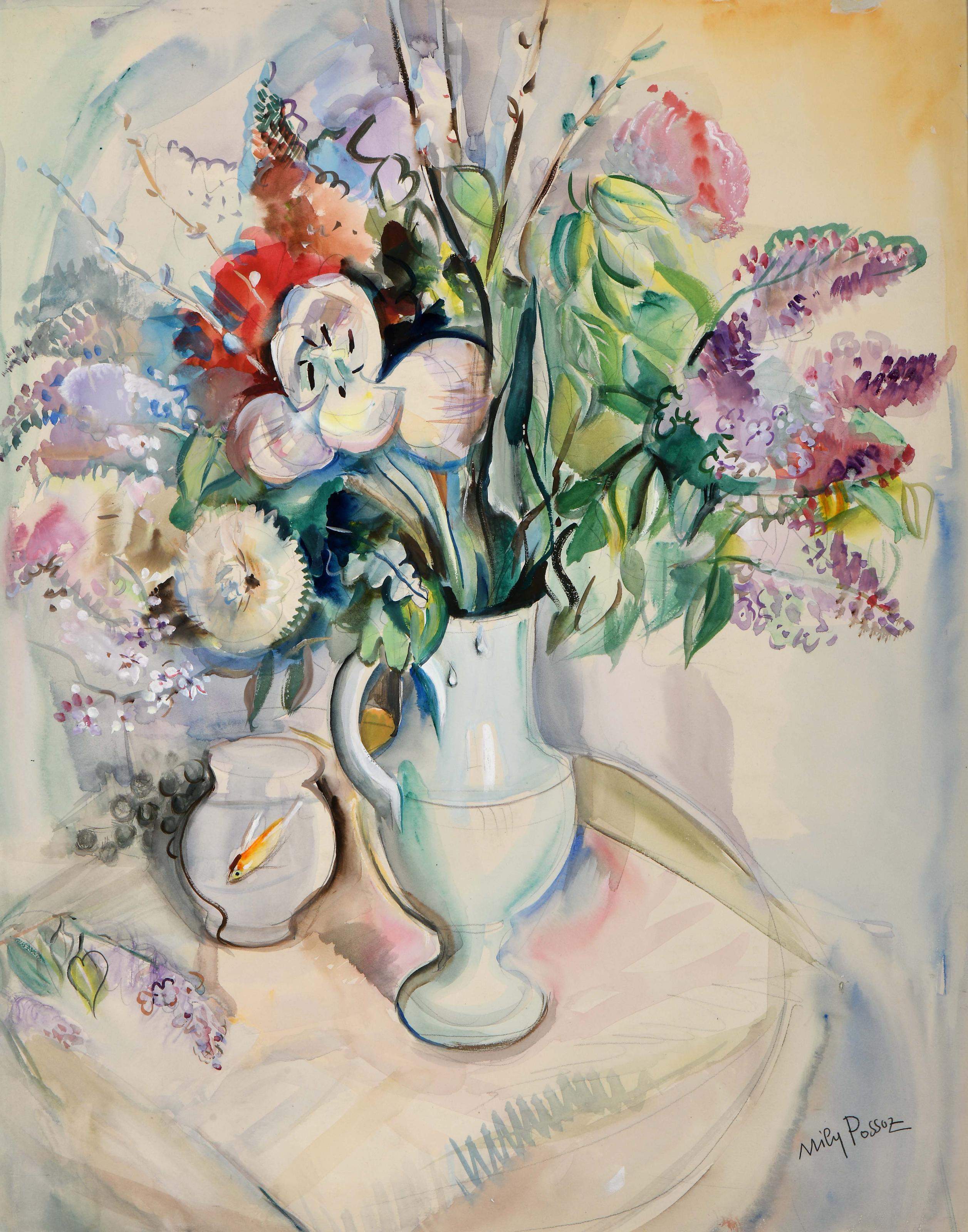 MILY POSSOZ - 1888-1968 Sem título (Jarra com flores e aquário) aguarela sobre papel assinada Dimensões (altura x comprimento x largura) - 61,5 x 41,5 cm