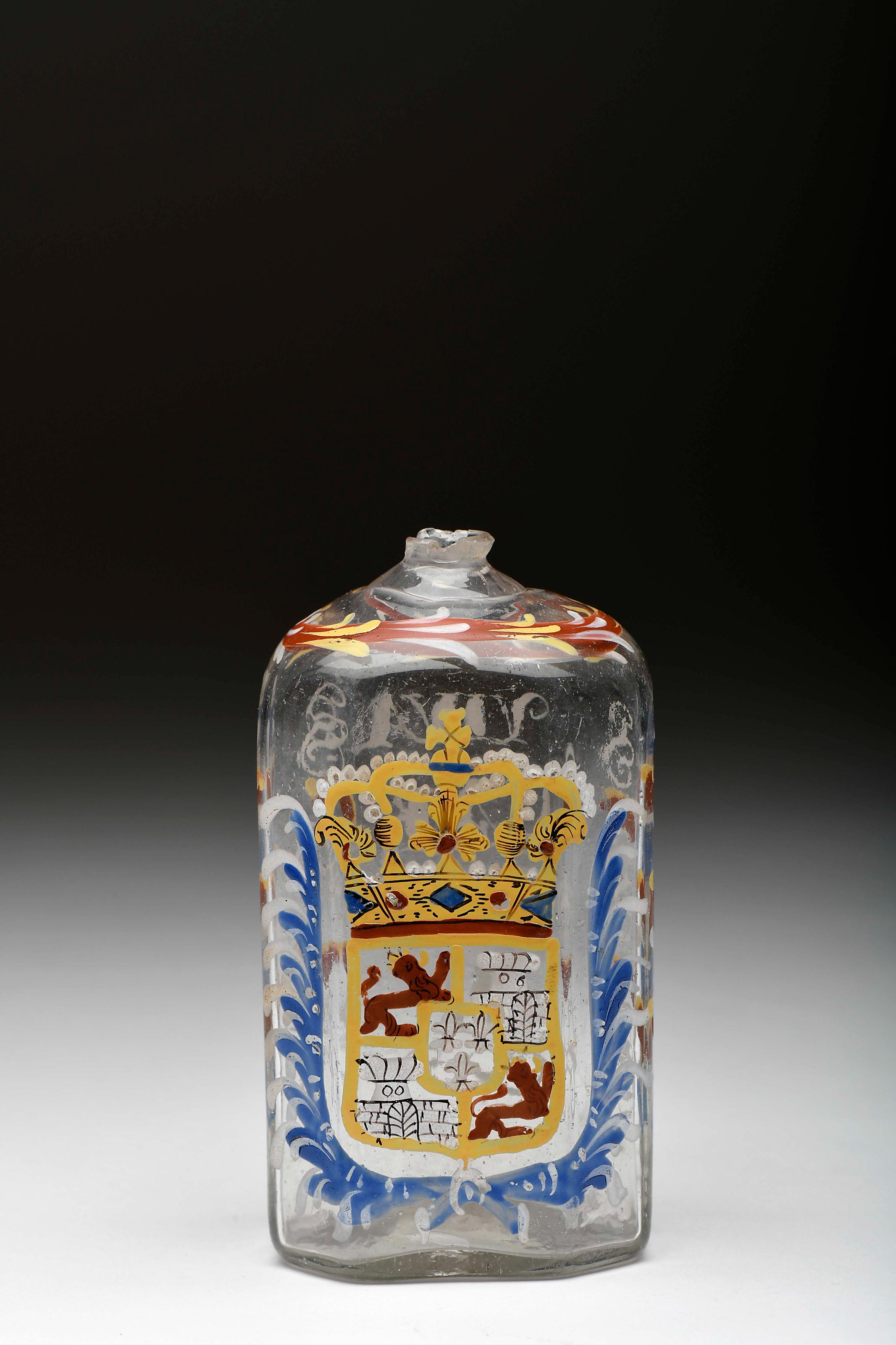 Frasco vidro pintado provavelmente da Fábrica de La Granja decoração policromada com armas de Carlos III, Rei de Espanha, e inscrição VIVA CARLOS III [1759-1788] Espanhol séc. XVIII (2ª metade) faltas no gargalo, falta do gargalo e da tampa em estanho Dimensões (altura x comprimento x largura) - 13 cm Notas: vd. exemplar com decoração semelhante em "El Vidrio Español en el Ermitage". Leningrado: Editorial de Artes Aurora, 1974, s/p, fig. 67.