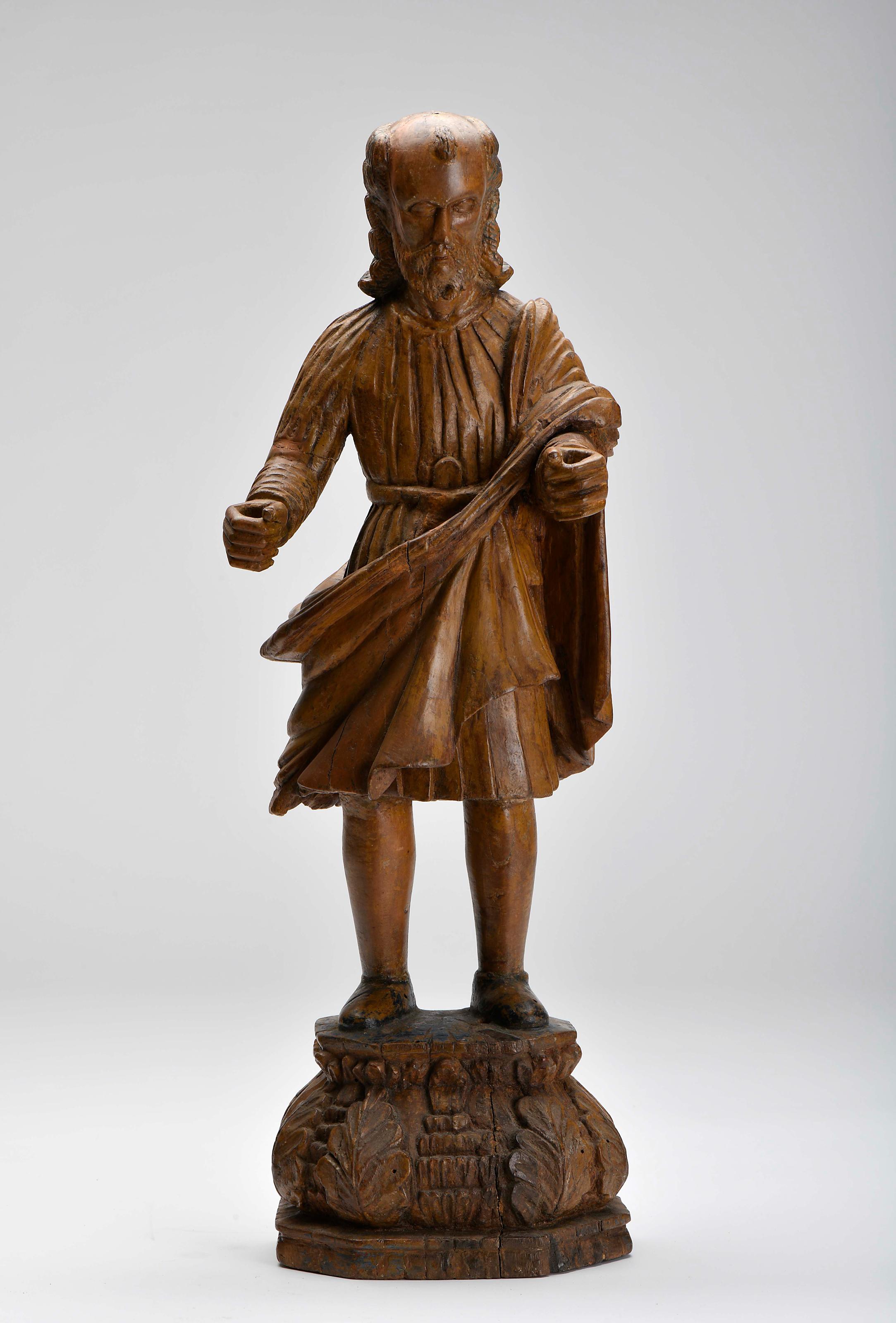 São José Peregrino Lusíada escultura em teca com restos de policromia sobre peanha entalhada "Folhas" vertente Indo-Portuguesa séc. XVII/XVIII pequenas faltas e defeitos, vestígios de insectos xilófagos Dimensões (altura x comprimento x largura) - (total) 59 cm