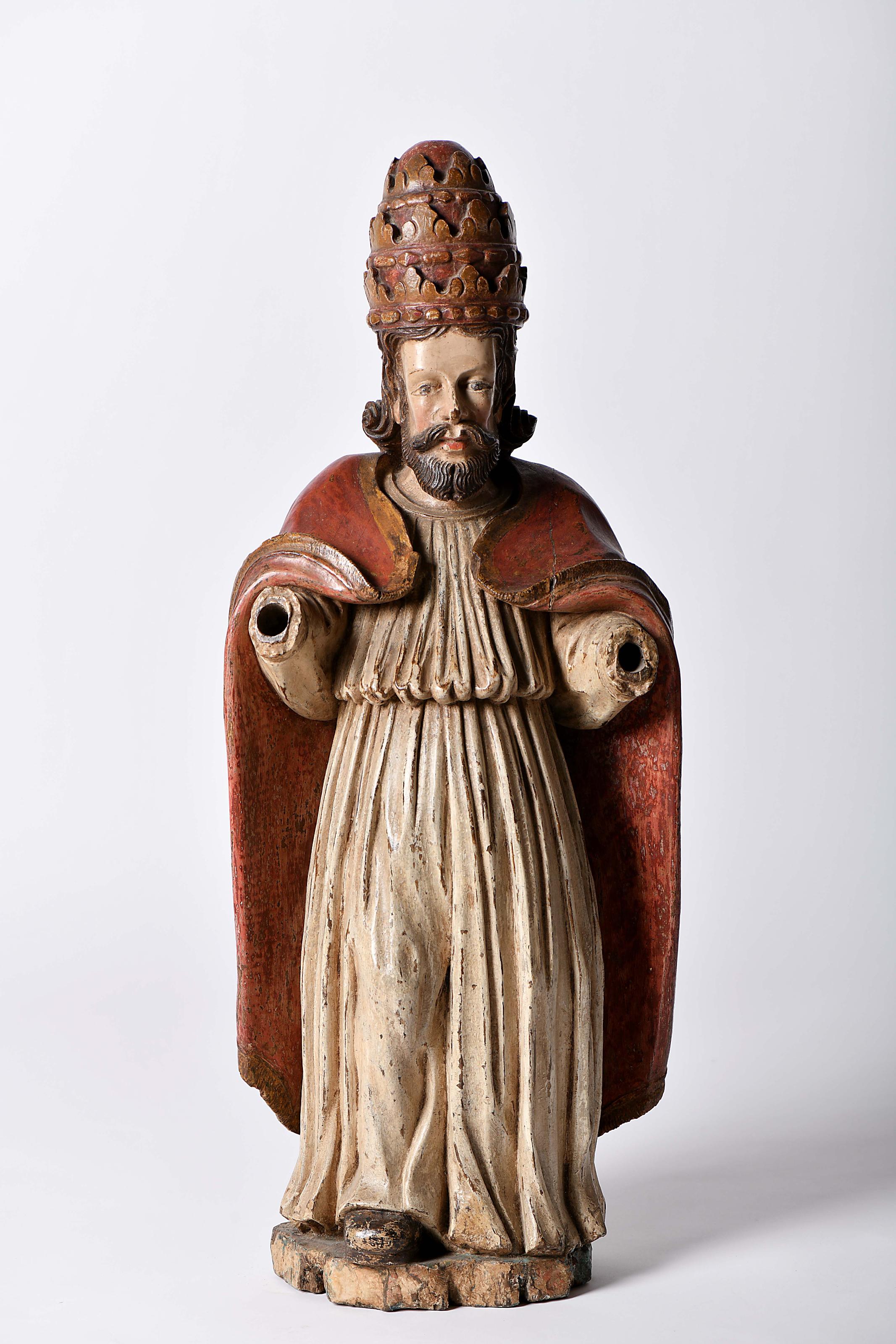 Santo Papa escultura em madeira policromada e dourada Portuguesa séc. XVII falta das mãos e da fíbula do manto, outras pequenas faltas e defeitos, faltas na policromia Dimensões (altura x comprimento x largura) - 80 cm