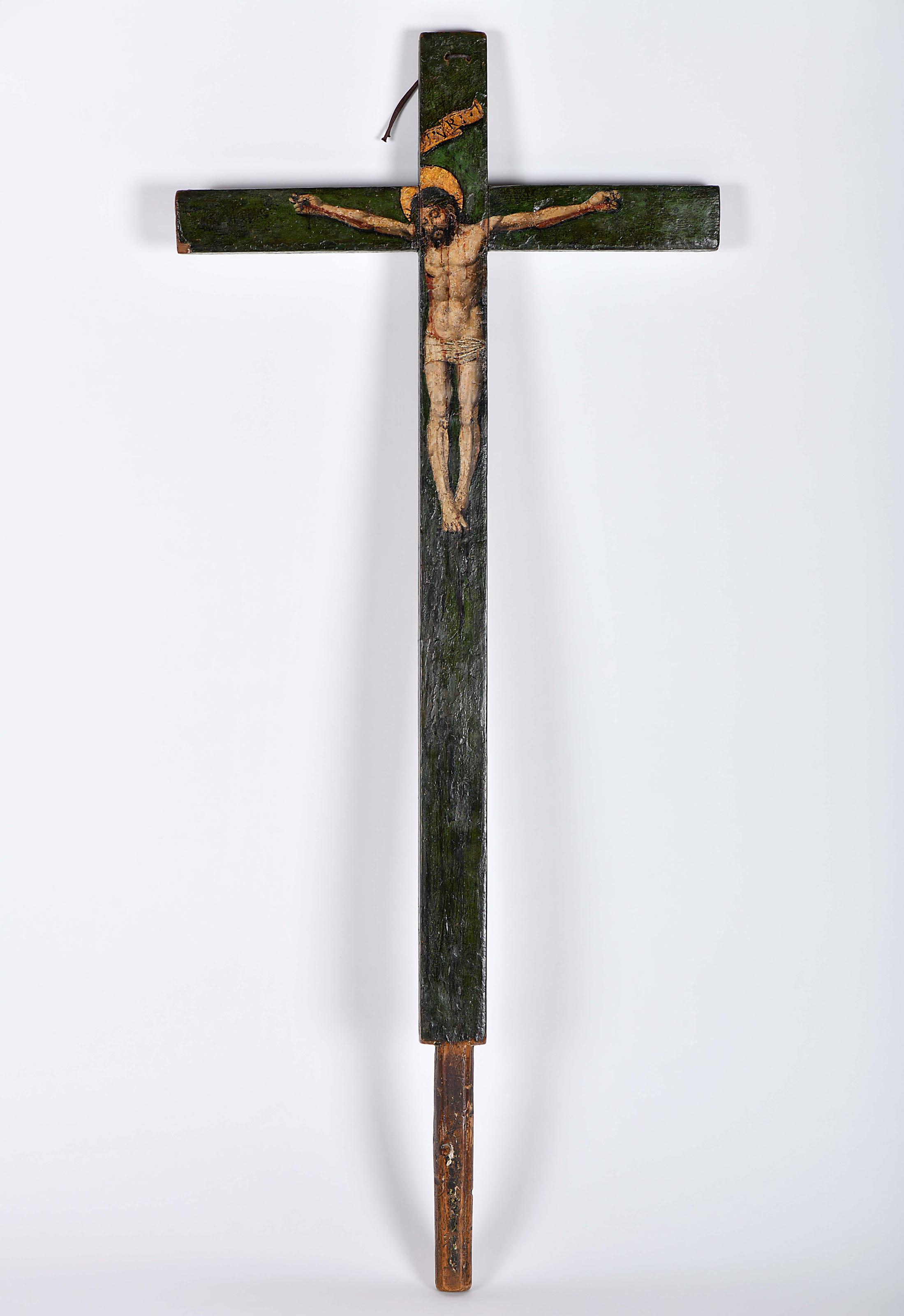 Cruz processional pinho de riga pintado a óleo com dourados "Cristo crucificado" Catalã séc. XV/XVI pequenas faltas na camada pictórica Dimensões (altura x comprimento x largura) - (cruz) 95 x 51,5 x 3,9 cm; (total) 119 cm