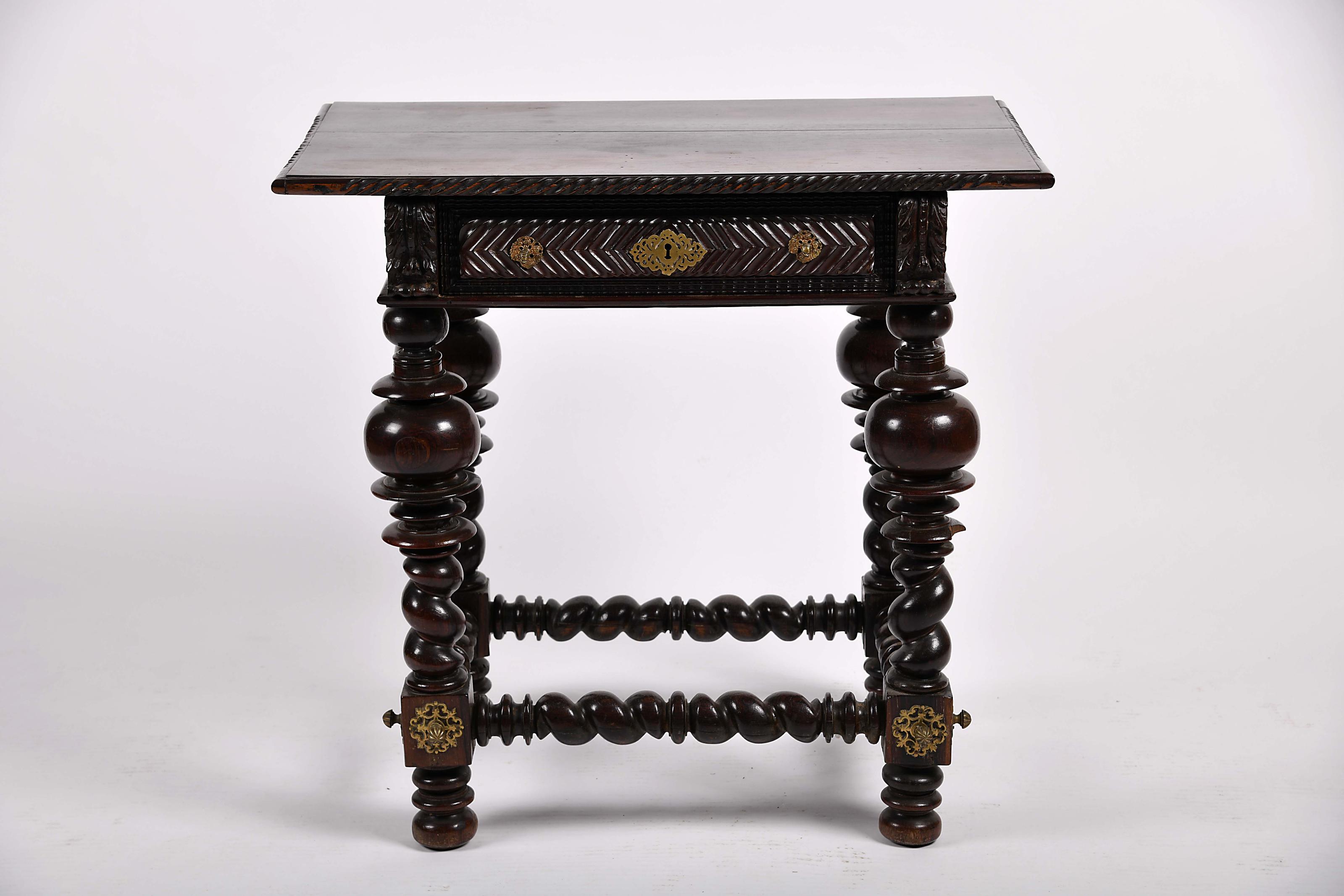 Bufete pau-santo e faixeado de pau-santo bordo do tampo e frente da gaveta com tremidos, pernas e travejamento torneados, aplicações em bronze recortado e vazado Português séc. XVII/XVIII fissura no tampo, pequenos restauros, pequenas faltas e defeitos, vestígios de insectos xilófagos na estrutura Dimensões (altura x comprimento x largura) - 79 x 82,5 x 54 cm