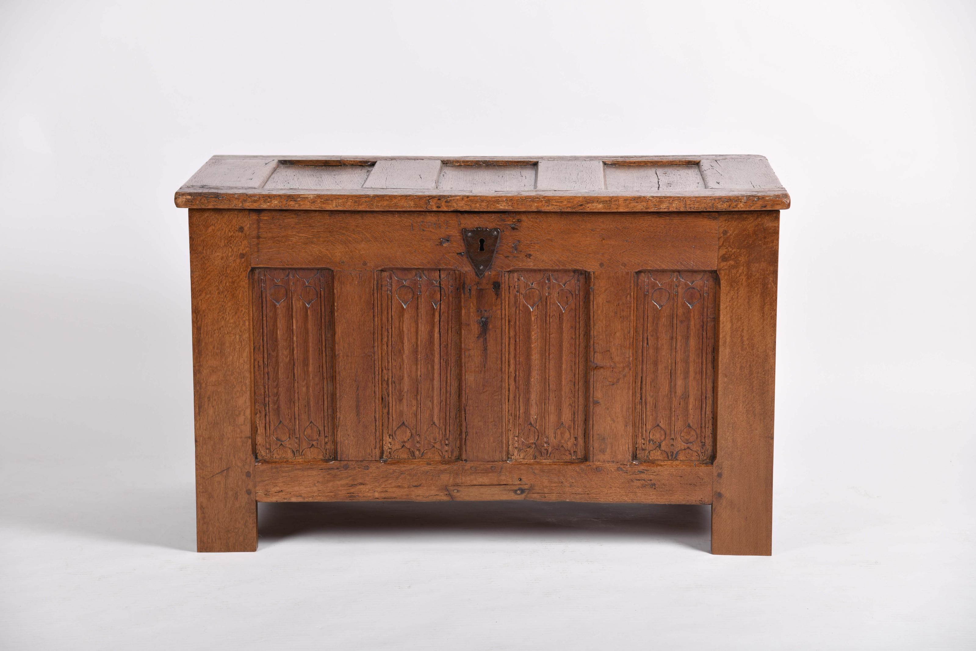 Arca tardo-gótica carvalho frente com painéis entalhados "Linho plissado", frente com inscrição sulcada I CORIS, interior com escaninho, ferragens em ferro Inglesa séc. XVI prumadas das pernas substituídas, outros restauros, pequenas faltas e defeitos, vestígios de insectos xilófagos Dimensões (altura x comprimento x largura) - 73 x 119 x 58 cm Notas: vd. FEDUCHI, Luis - “Historia del Mueble”. Madrid: Editorial Abantos, 1966, pp. 259 e 261, nºs 217 e 221.