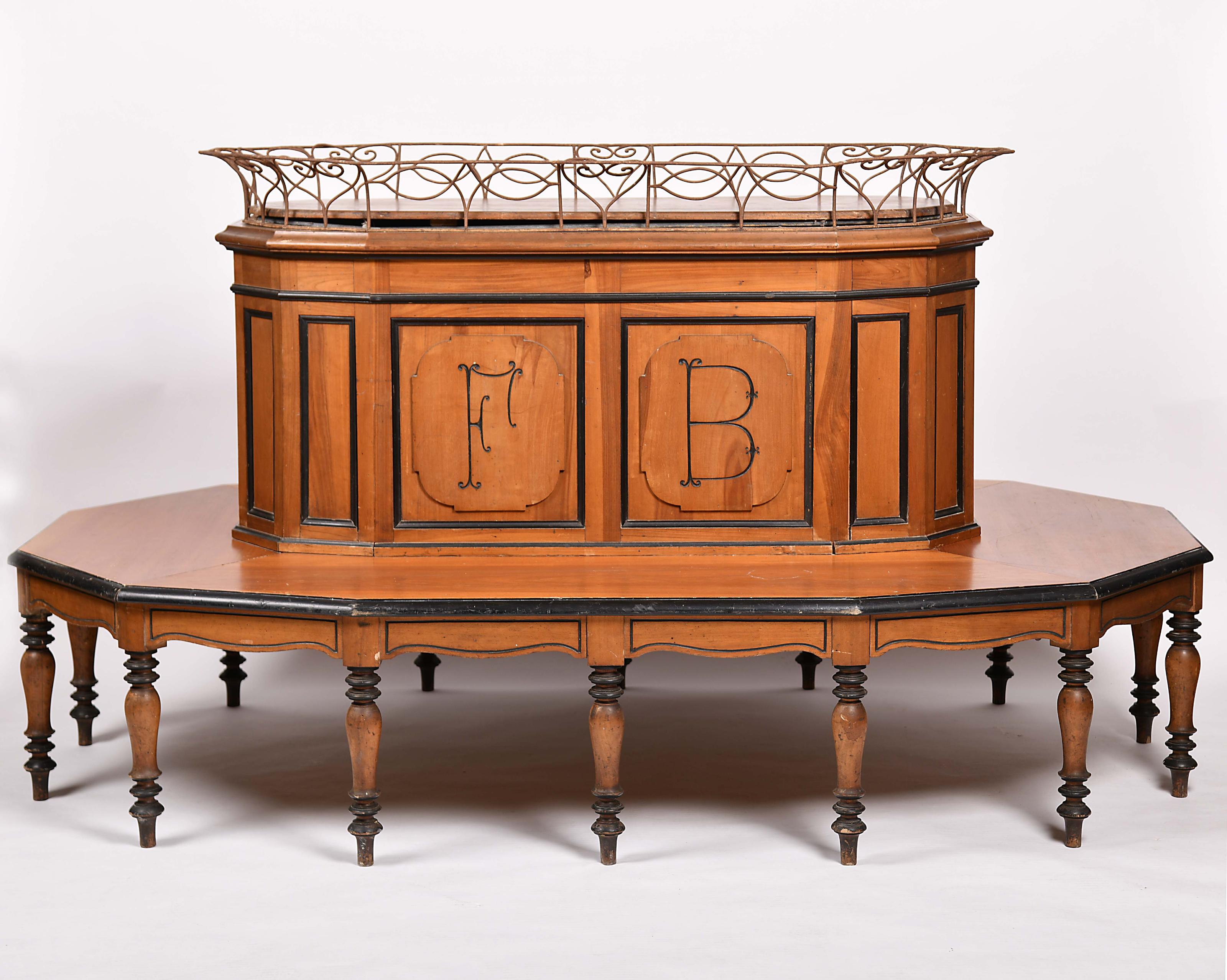 Banco de centro com floreira romântico cerejeira e outras madeiras faixas ebanizados, painéis relevados com decoração sulcada e iniciais FB, pernas torneadas, gradinha em ferro, floreira em chumbo Português séc. XIX/XX pequenas faltas e defeitos, vestígios de insectos xilófagos, grade oxidada Dimensões (altura x comprimento x largura) - 121 x 223 x 156 cm