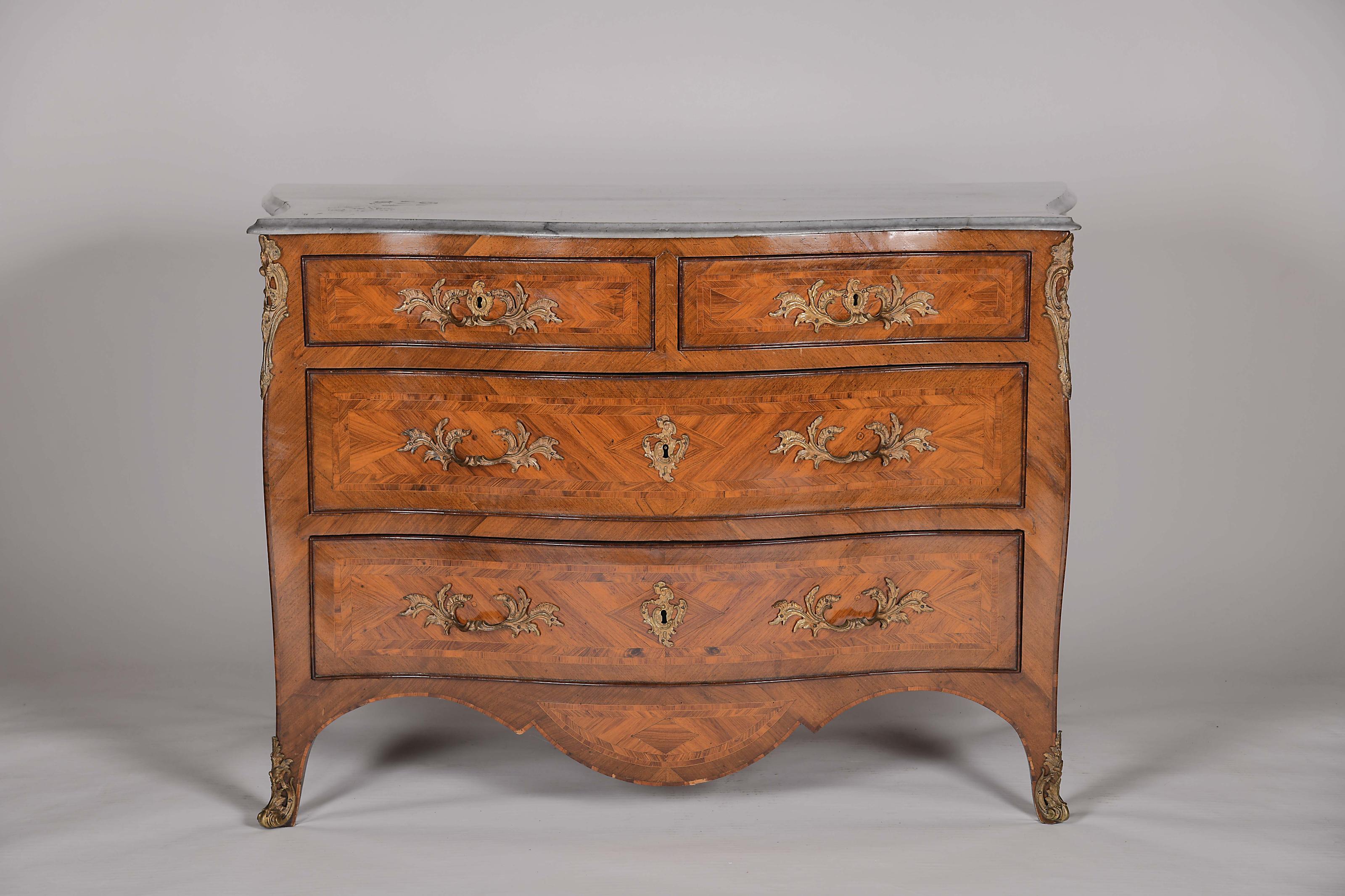 Cómoda estilo Luís XV marchetaria de folheado de mogno e folheado de pau-rosa ferragens em bronze relevado, vazado e dourado, tampo em mármore Europeia séc. XIX (1ª metade) pequenas faltas e defeitos, desgaste no dourado Dimensões (altura x comprimento x largura) - 92,5 x 134 x 68 cm