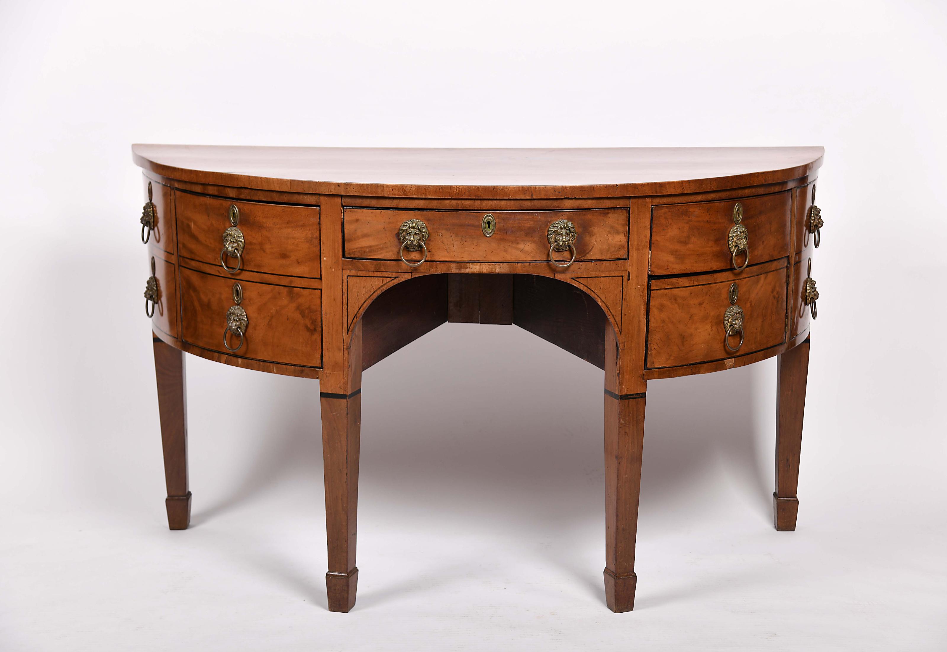 Sideboard de meia-lua Jorge IV (1820-1830) mogno e folheado de raiz de mogno filetes em ébano, puxadores em metal amarelo relevado "Fauces de leão" Inglês pequenas faltas no folheado e nos frisos, outras pequenas faltas e defeitos, vestígios de insectos xilófagos Dimensões (altura x comprimento x largura) - 96 x 167 x 73 cm Notas: vd. ANDREWS, John - “British Antique Furniture”. Woodbridge, Sufolk: Antique Collector’s Club Ltd, 1989, p. 270, fig. 84.