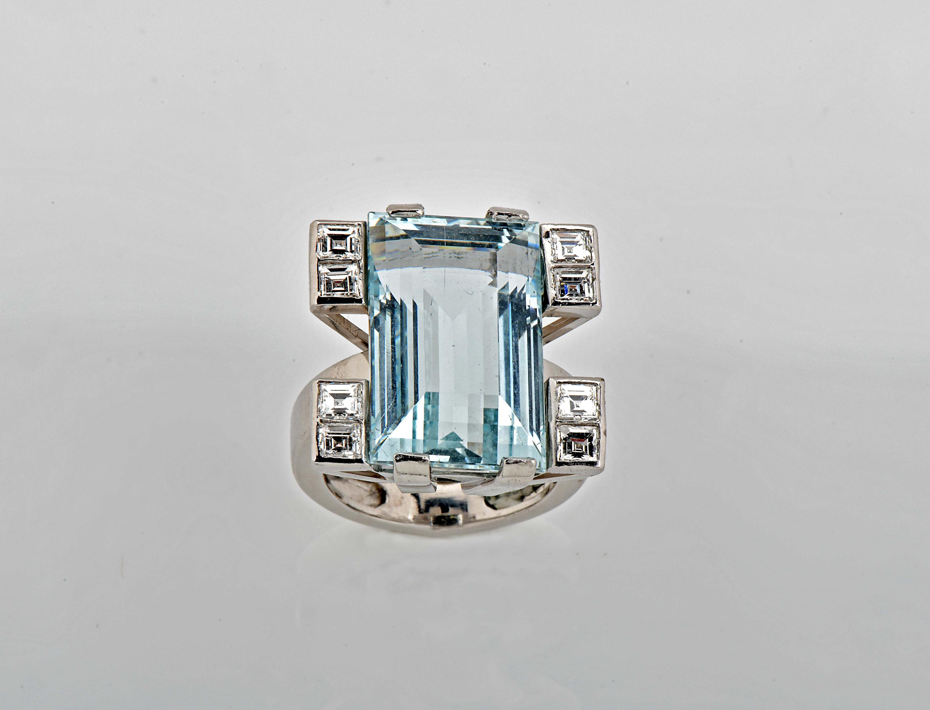 Anel ouro de 800/1000 cravejado com água-marinha em talhe rectangular com o peso aproximado de 22,30 ct. e 8 diamantes em talhe quadrado com o peso aproximado de 1,20 ct. Português contraste de Lisboa (1985-2020), marca de ourives de Oliveira Lopes e Almeida Ldª (reg. 1971) Dimensões (altura x comprimento x largura) - 14 (17 mm) cm; Peso - 17,6 g. Notas: vd. VIDAL, Manuel Gonçalves; ALMEIDA, Fernando Moitinho de - "Marcas de Contrastes e Ourives Portugueses (1887 a 1993)", vol. II. Lisboa: IN-CM, 1996, nºs 4093 e 4322.