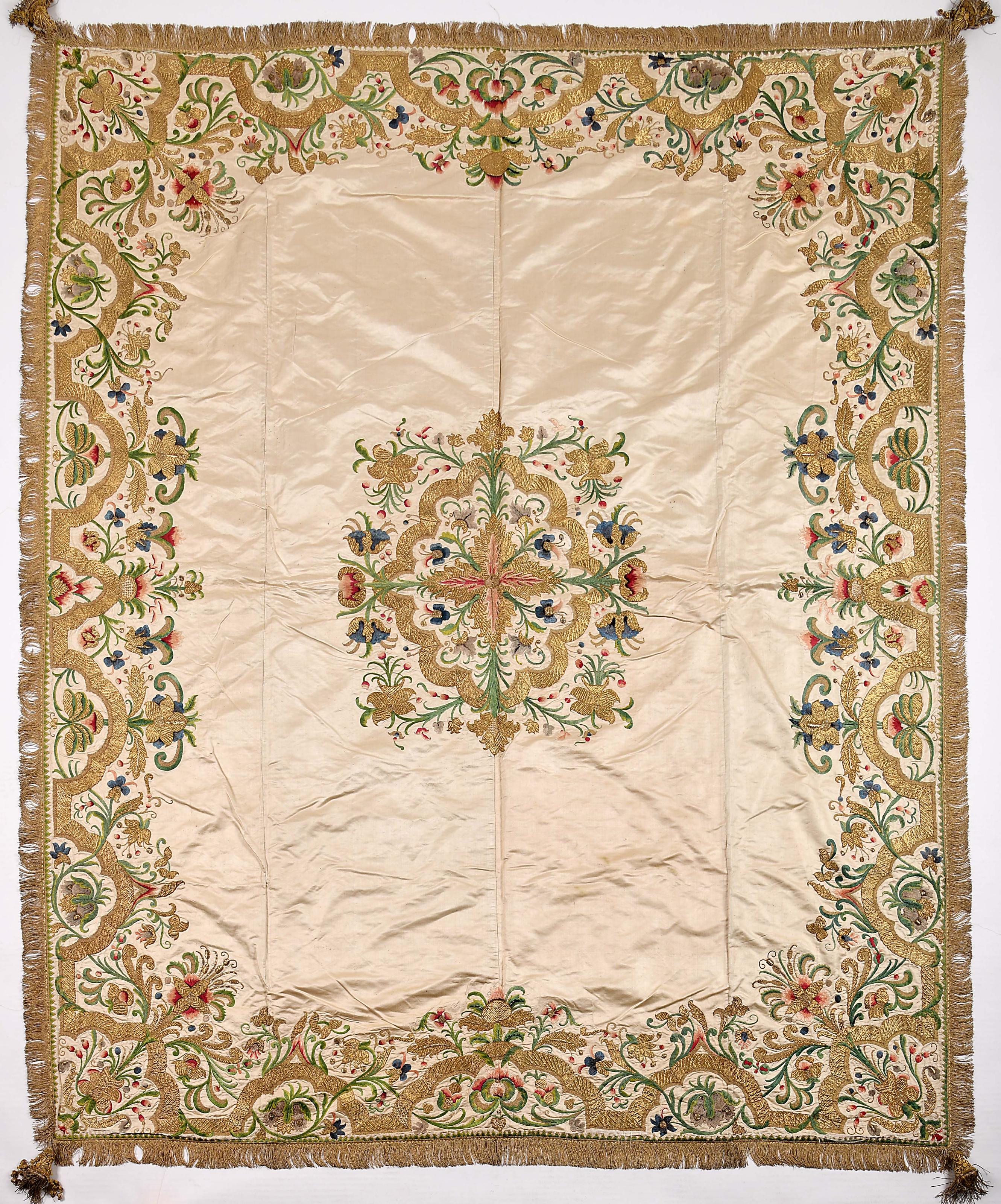 Colcha ou pano de armar seda bordada a fio de seda policromada e a fio metálico dourado “Flores” franja em fio metálico com borlas nos quatro cantos Europeia séc. XVIII (meados) pequenas manchas, pequenos defeitos, forrada Dimensões (altura x comprimento x largura) - 238 x 202 cm