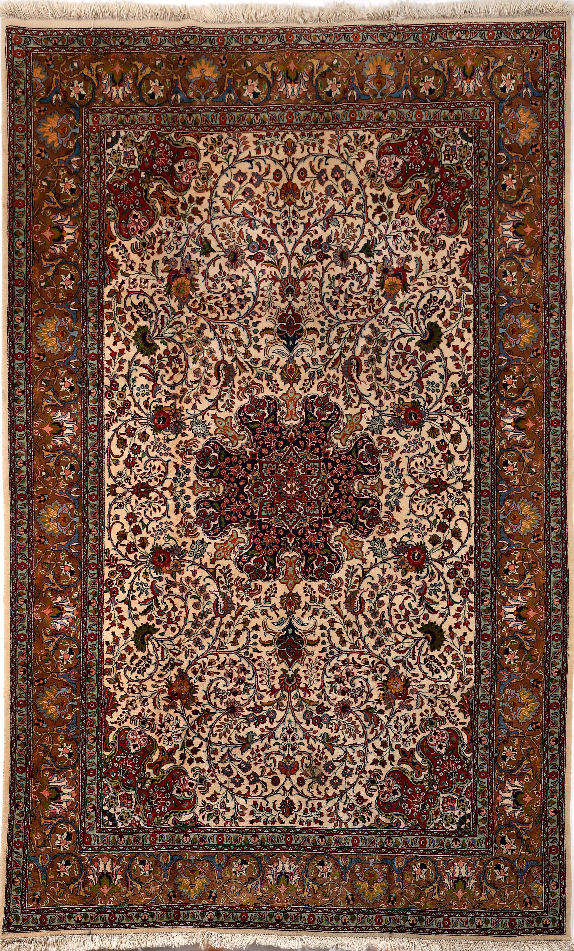 Tapete Tabriz fio de lã decoração policromada, medalhão floral "Flores e enrolamentos vegetalistas" sobre fundo bege Iraniano séc. XX (4º quartel) pequenos defeitos, sinais uso Dimensões (altura x comprimento x largura) - 305 x 185 cm