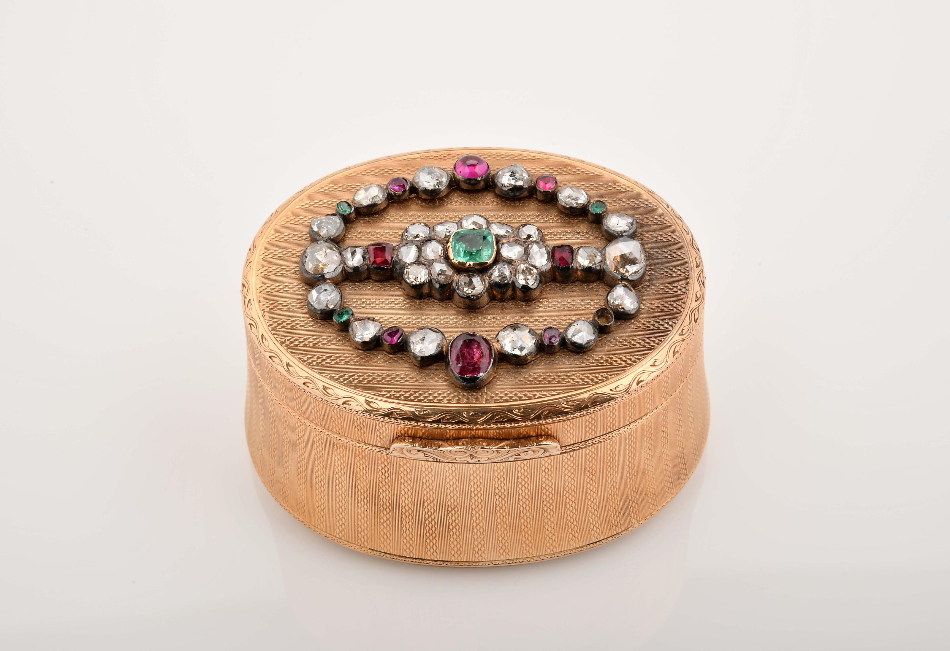 Caixa oval ouro de 585/1000 (56 zolotnicks) decoração guilhochada, tampa com aplicação em prata cravejada com esmeralda forrada, rubis, granada, diamantes em talhe rosa e 4 em talhe antigo de brilhante com o peso aproximado de 0,60 ct. Europa de Leste séc. XX (inícios) falta de uma esmeralda, uma pedra substituída, aplicação possivelmente adaptada marca de garantia de teor, sem marcas portuguesas, ao abrigo do Decreto-Lei nº 120/2017, de 15 de Setembro - art. 2º, nº 2, alínea c) Dimensões (altura x comprimento x largura) - 4 x 7 x 6 cm; Peso - 131,6 g.