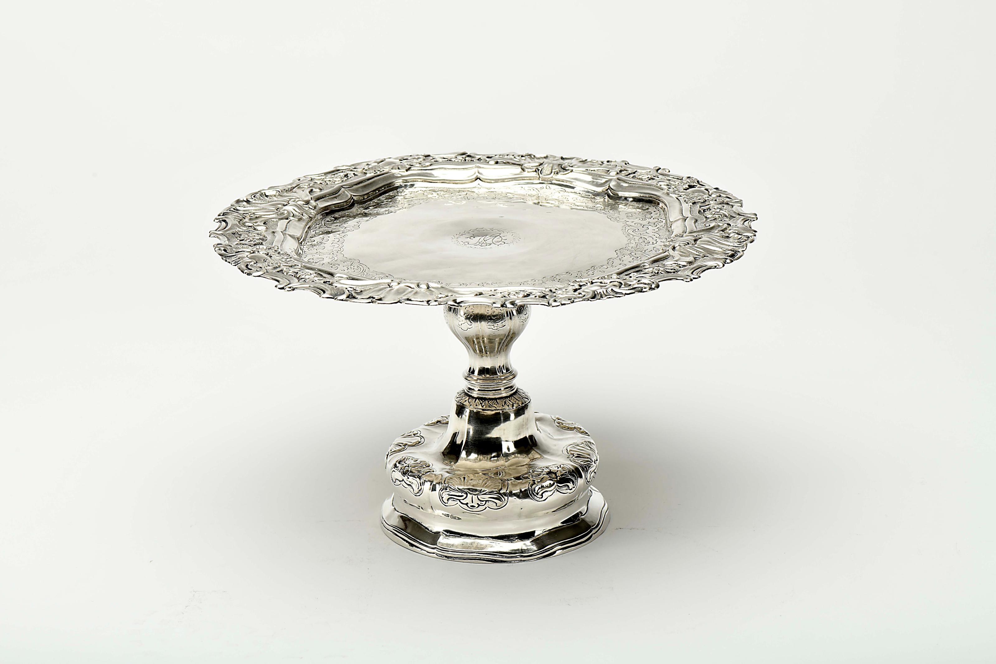 Salva de pé alto D. José (1750-1777) prata decoração relevada e gravada "Flores, volutas e concheados", centro gravado com monograma Brasileira pé com fissura, pequenas amolgadelas sem marcas, ao abrigo do Decreto-Lei nº 120/2017, de 15 de Setembro - art. 2º, nº 2, alínea c) Dimensões (altura x comprimento x largura) - 17 x 29,5 cm; Peso - 874 g.