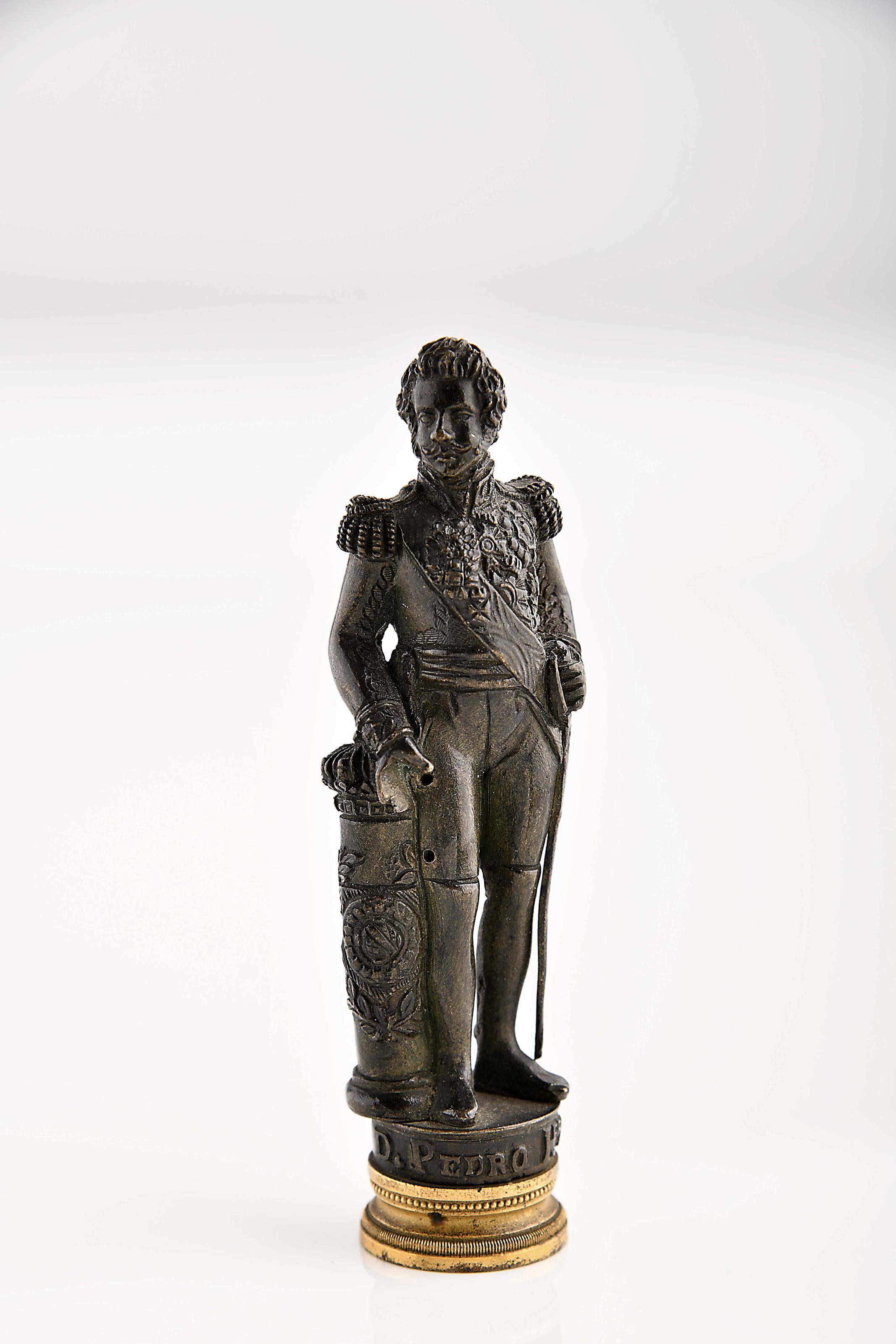 D. Pedro I - Imperador do Brasil (1798-1834) mão de sinete em bronze base com inscrição "D. PEDRO Iᴱᴿ IMP.", mesa em bronze dourado Francês séc. XIX (1º terço) falta das Cartas Constitucionais de Portugal e Brasil que teriam a inscrição CARTA BRAZILRᴬ PORTUGᶻᵃ marcada na parte superior da base COQUARDON F. - PALAIS ROYAL - nº 15 Dimensões (altura x comprimento x largura) - 10,5 cm