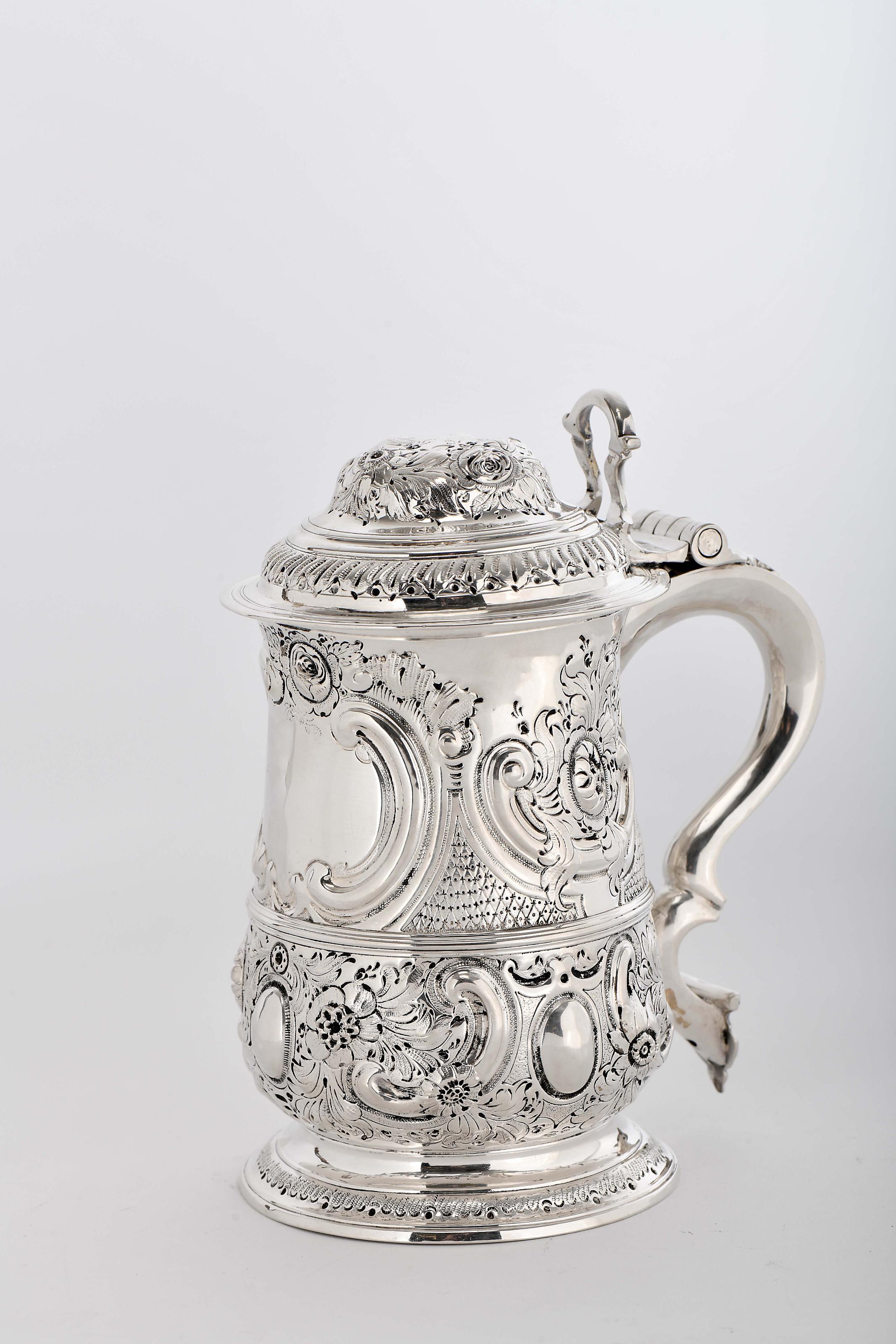 Tankard Jorge II (1727-1760) prata de 925/1000 decoração relevada "Flores e concheados" Inglês marca de Londres (1750), marca de ourives de Fuller White (1746-1758), sem marcas portuguesas, ao abrigo do Decreto-Lei nº 120/2017, de 15 de Setembro - art. 2º, nº 2, alínea c) Dimensões (altura x comprimento x largura) - 19,5 cm; Peso - 799 g.