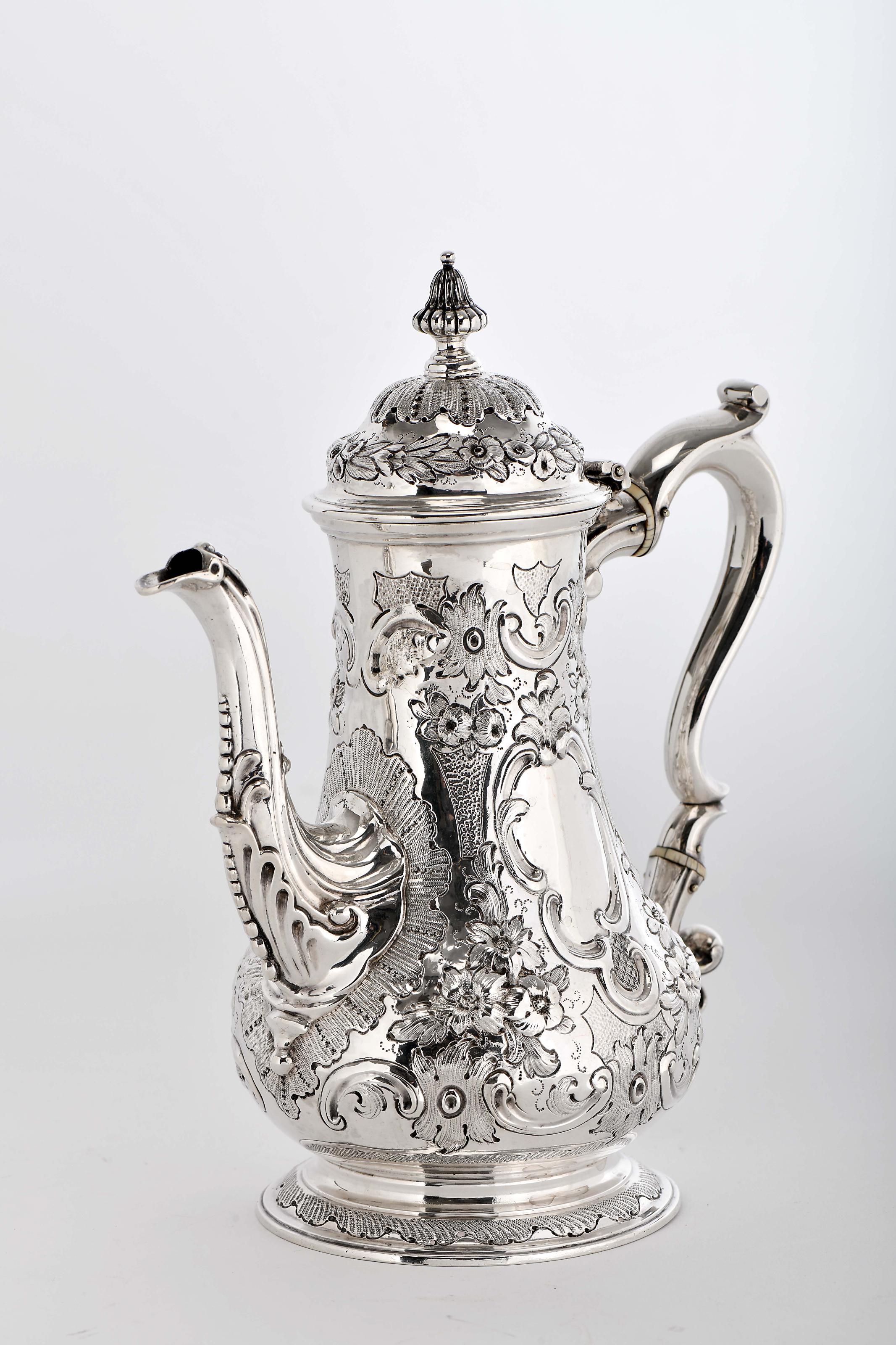 Cafeteira Jorge III (1760-1820) prata de 925/1000 decoração relevada "Flores e concheados", frisos relevados, anilhas térmicas em osso Inglesa pega com amolgadela, outras pequenas amolgadelas marca de Londres (1763), marca de ourives de William and Robert Peaston (1761-1763), sem marcas portuguesas, ao abrigo do Decreto-Lei nº 120/2017, de 15 de Setembro - art. 2º, nº 2, Dimensões (altura x comprimento x largura) - 25,5 cm; Peso - 841 g.