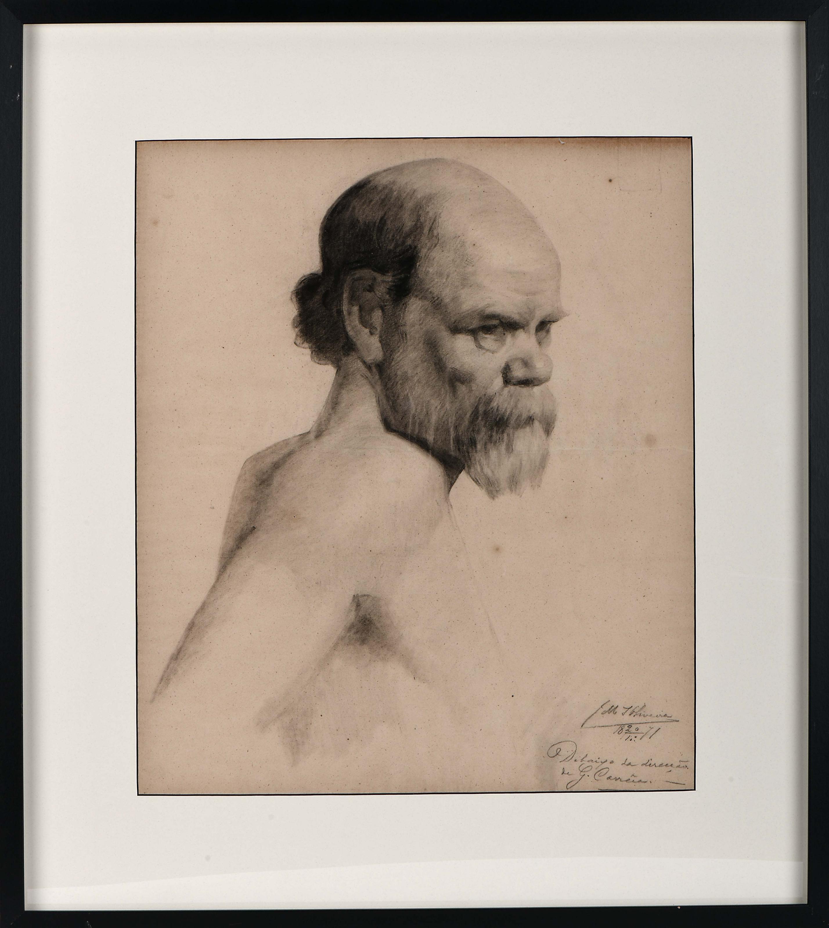 MARQUES DE OLIVEIRA - 1853-1927 Academia - Ancião carvão sobre papel vinco no suporte, pequenos picos de acidez assinado e datado de 20-12-1871, inscrição manuscrita DEBAIXO DA DIREÇÃO DE G. CORREIA Dimensões (altura x comprimento x largura) - 51 x 45,5 cm
