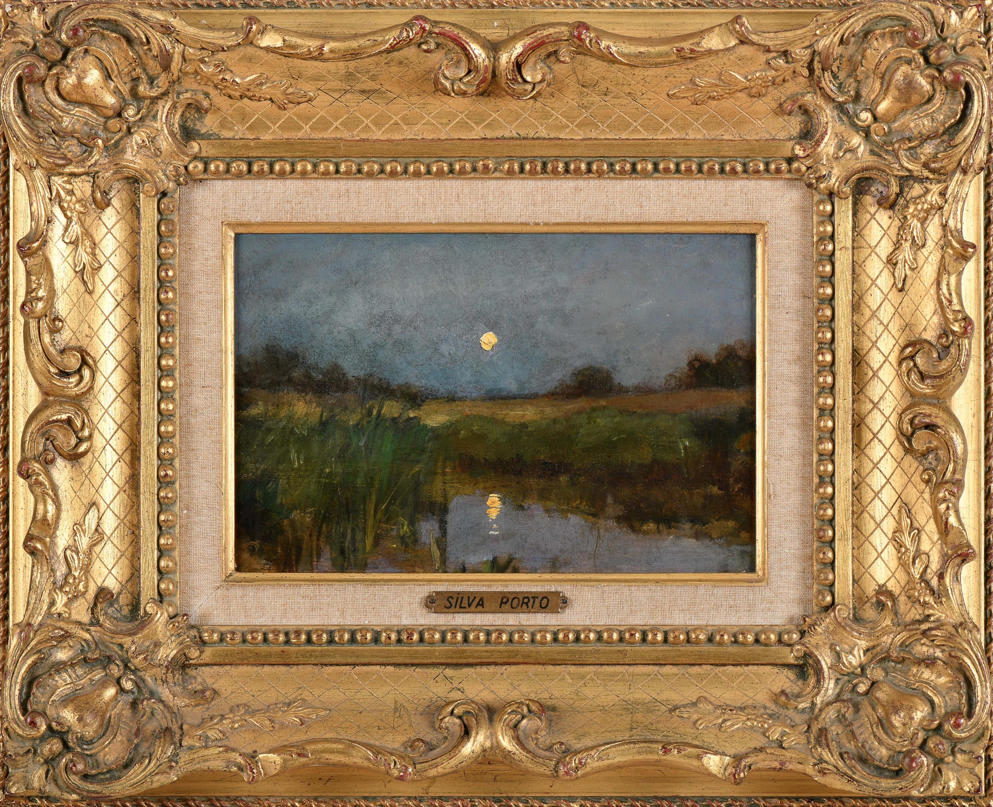 SILVA PORTO - 1850-1893 Nocturno óleo sobre madeira não assinado, verso com carimbo do leilão Silva Porto Dimensões (altura x comprimento x largura) - 20 x 30 cm