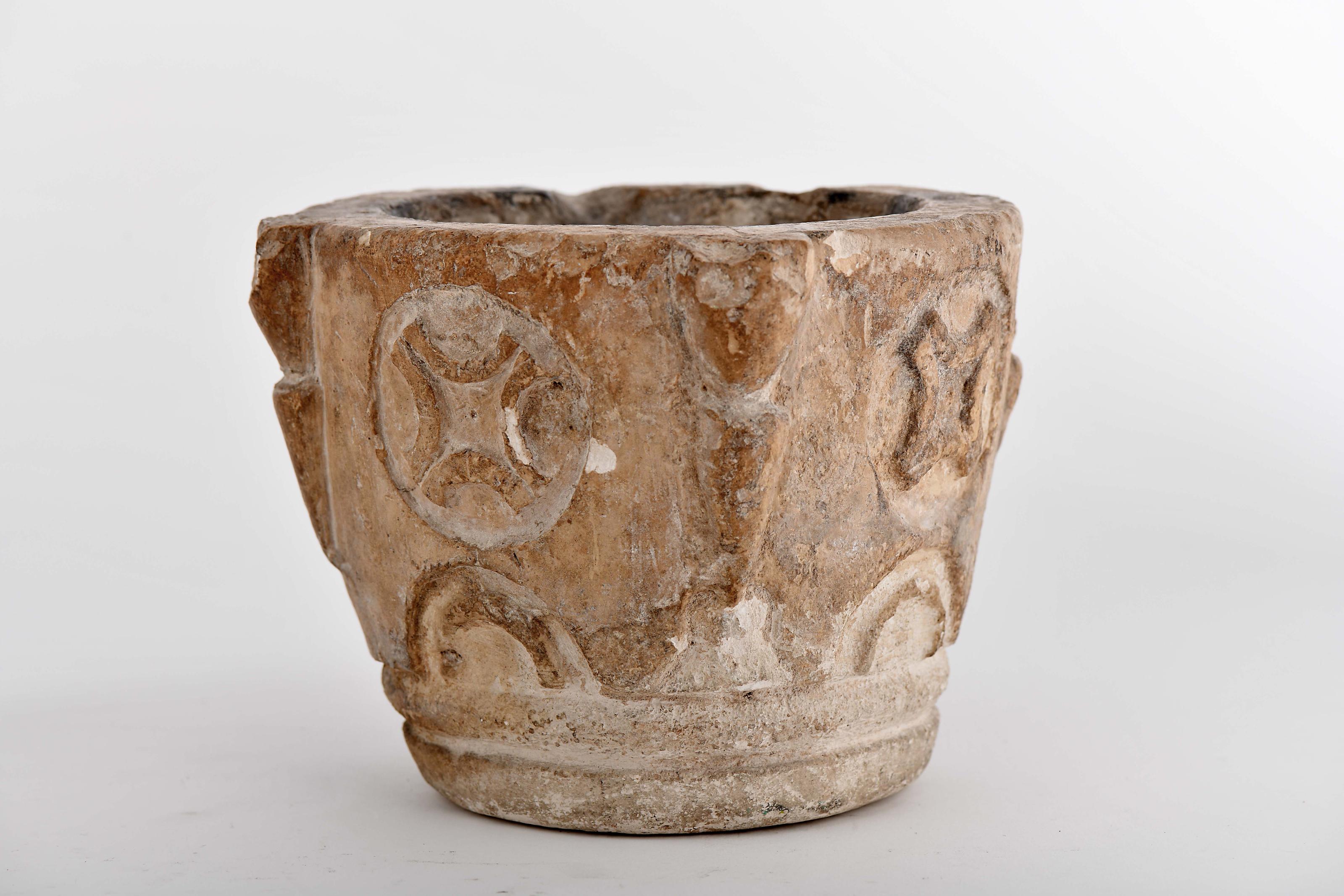 Almofariz grande românico pedra decoração esculpida "Símbolos lapidários", nervuras relevadas "Colunelos" Aragonês séc. XII/XIII pequenas faltas e defeitos, desgaste Dimensões (altura x comprimento x largura) - 16,2 x 23,5 x 22 cm