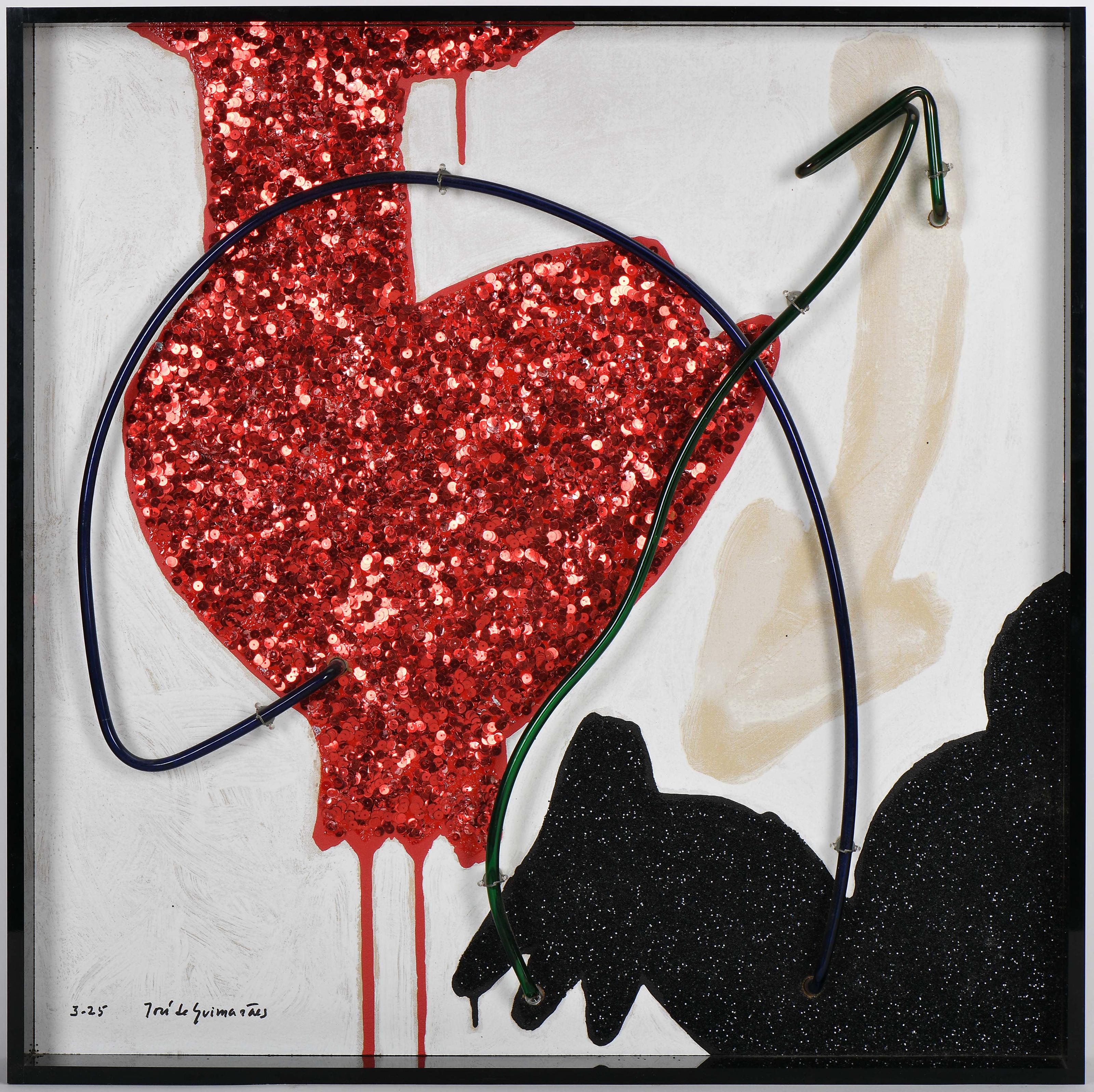 JOSÉ DE GUIMARÃES - NASC. 1939 Sem título técnica mista em caixa luminosa com colagens e diversos materiais assinado, numerado 3/25 Dimensões (altura x comprimento x largura) - 63 x 63 cm