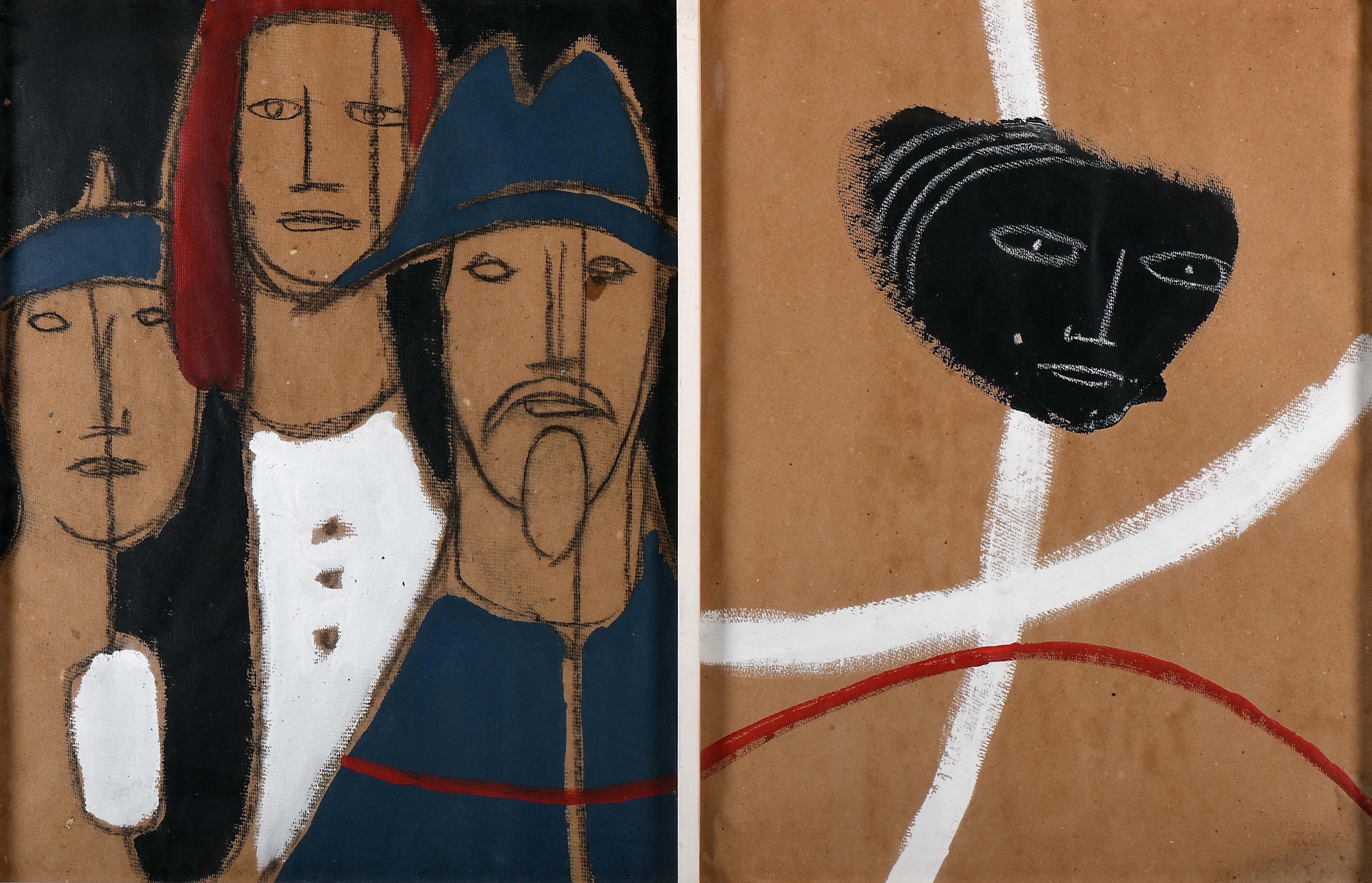 MARTINS CORREIA - 1910-1999 Sem título díptico - óleo sobre papel «craft» pequenos defeitos no suporte assinado Dimensões (altura x comprimento x largura) - 64,5 x 98,5 cm Notas: segundo o proprietário a presente obra representará «auto-Retrato com as duas mulheres» e «alegoria à mulher idealizada».