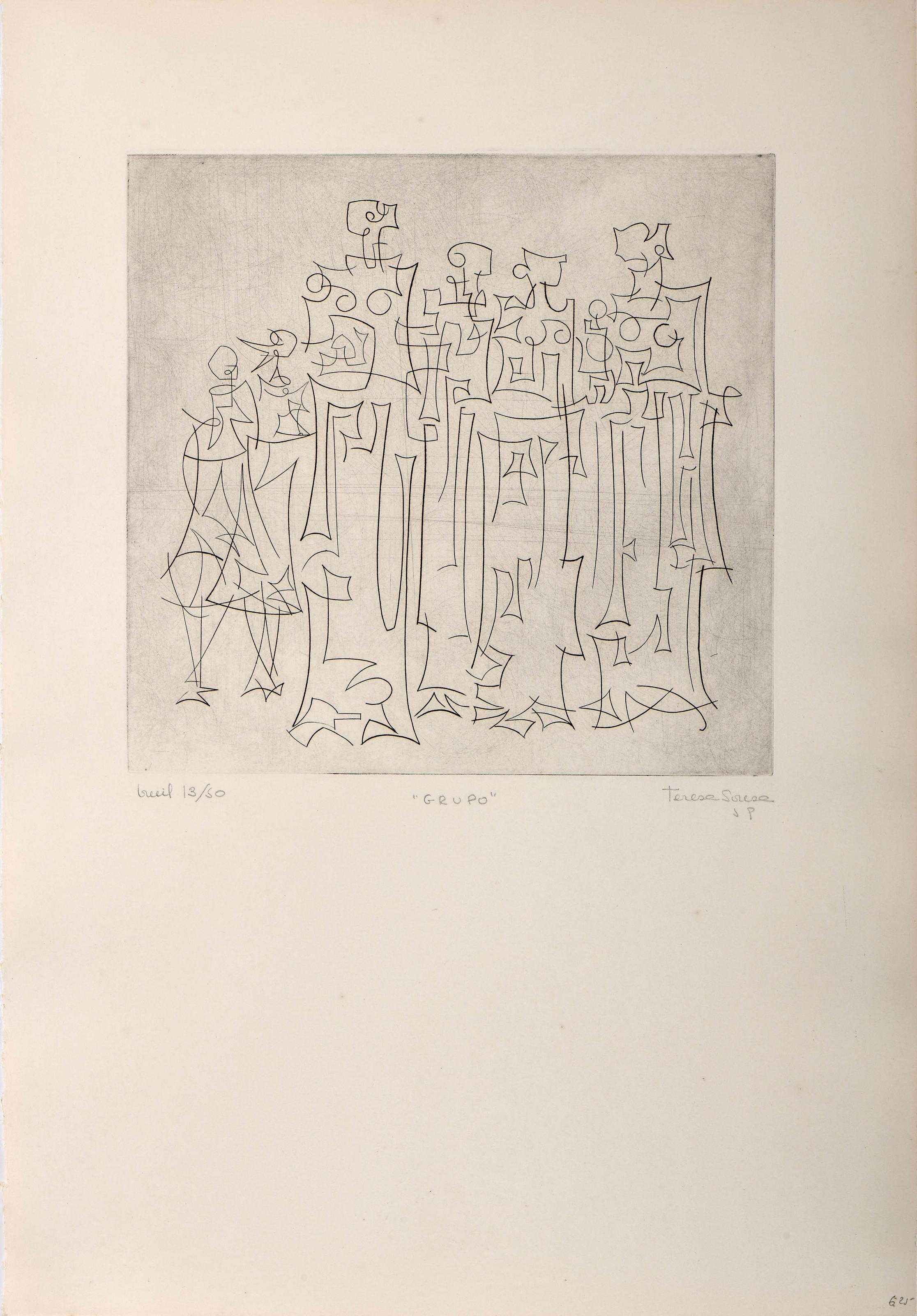 TERESA SOUSA - 1928-1962 "Grupo" gravura a buril sobre cobre estampado em papel assinada e datada de 1959, numerada 13/50 Dimensões (altura x comprimento x largura) - (mancha) 23,4 x 24,5 cm; (papel) 50 x 35 cm Notas: Apesar da sua formação académica em Pintura, Teresa Sousa descobriu em Paris, por recomendação de Vieira da Silva, a sua vocação para a gravura. Entre 1955 e 1956 estudou com S. W. Hayter no célebre Atelier 17, experiência decisiva e inovadora numa época em que a gravura artística era pouco valorizada em Portugal.As suas primeiras obras de gravura, de 1956, em técnicas calcográficas (buril, água-forte e processo misto, este uma combinação de duas ou mais técnicas), revelam a influência de Hayter e do Atelier 17. Contudo, Teresa Sousa explorou também linoleogravura, litografia, xilogravura e serigrafia. A formação no Atelier 17 foi essencial para o seu reconhecimento como pioneira da gravura moderna portuguesa, consolidado com o prémio de gravura que lhe foi atribuído na I Exposição de Artes Plásticas da Fundação Calouste Gulbenkian, em 1957, apenas 2 anos após o início dos seus estudos de gravura no Atelier 17.Entre 1955 e 1961 foi uma artista prolífica e premiada, mas a morte precoce aos 33 anos acabados de fazer interrompeu uma carreira promissora. Deixou diversos trabalhos e estudos inacabados.Presentemente os filhos da artista estão a divulgar a obra da sua mãe e a tentar recolocar o seu nome no panorama das artes plásticas em Portugal, tendo até agora conseguido promover a realização de cinco exposições: “(Re)Descobrir Teresa Sousa. Gravura – 60 anos depois” - Biblioteca Nacional de Portugal, 07-11-2022 a 25-02-2023, e Biblioteca Pública de Évora, 15-04-2023 a 20-05-2023; “Teresa Sousa – fragmentos de um breve percurso” - Centro UNESCO, Beja, 08-11-2023 a 29-12-2023; “Teresa Sousa (1928-1962) – Biografia Ilustrada” - Galeria Municipal do Onze, Setúbal, 03-02-2024 a 09-03-2024; e “Continuar a (re)descobrir Teresa Sousa (1928-1962)” - Galeria Municipal TREM - Manuel Baptista, Faro, 12 de Julho a 11 de Outubro de 2025.