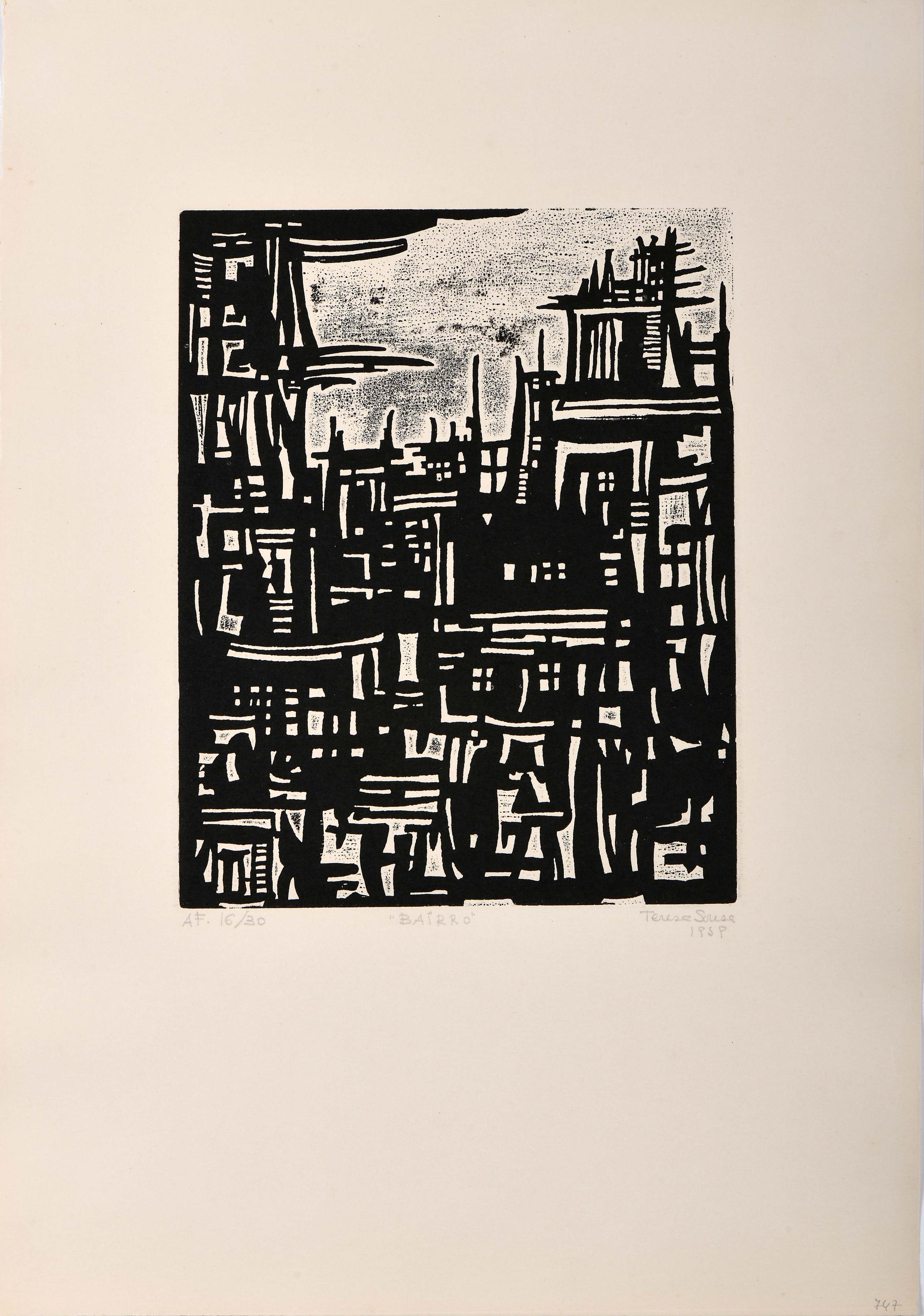 TERESA SOUSA - 1928-1962 "Bairro" água-forte, mordedura profunda sobre placa de zinco estampada em papel assinada e datada de 1959, numerada 16/30 Dimensões (altura x comprimento x largura) - (mancha) 26,4 x 20,9 cm; (papel) 50 x 35 cm Notas: Apesar da sua formação académica em Pintura, Teresa Sousa descobriu em Paris, por recomendação de Vieira da Silva, a sua vocação para a gravura. Entre 1955 e 1956 estudou com S. W. Hayter no célebre Atelier 17, experiência decisiva e inovadora numa época em que a gravura artística era pouco valorizada em Portugal.As suas primeiras obras de gravura, de 1956, em técnicas calcográficas (buril, água-forte e processo misto, este uma combinação de duas ou mais técnicas), revelam a influência de Hayter e do Atelier 17. Contudo, Teresa Sousa explorou também linoleogravura, litografia, xilogravura e serigrafia. A formação no Atelier 17 foi essencial para o seu reconhecimento como pioneira da gravura moderna portuguesa, consolidado com o prémio de gravura que lhe foi atribuído na I Exposição de Artes Plásticas da Fundação Calouste Gulbenkian, em 1957, apenas 2 anos após o início dos seus estudos de gravura no Atelier 17.Entre 1955 e 1961 foi uma artista prolífica e premiada, mas a morte precoce aos 33 anos acabados de fazer interrompeu uma carreira promissora. Deixou diversos trabalhos e estudos inacabados.Presentemente os filhos da artista estão a divulgar a obra da sua mãe e a tentar recolocar o seu nome no panorama das artes plásticas em Portugal, tendo até agora conseguido promover a realização de cinco exposições: “(Re)Descobrir Teresa Sousa. Gravura – 60 anos depois” - Biblioteca Nacional de Portugal, 07-11-2022 a 25-02-2023, e Biblioteca Pública de Évora, 15-04-2023 a 20-05-2023; “Teresa Sousa – fragmentos de um breve percurso” - Centro UNESCO, Beja, 08-11-2023 a 29-12-2023; “Teresa Sousa (1928-1962) – Biografia Ilustrada” - Galeria Municipal do Onze, Setúbal, 03-02-2024 a 09-03-2024; e “Continuar a (re)descobrir Teresa Sousa (1928-1962)” - Galeria Municipal TREM - Manuel Baptista, Faro, 12 de Julho a 11 de Outubro de 2025.