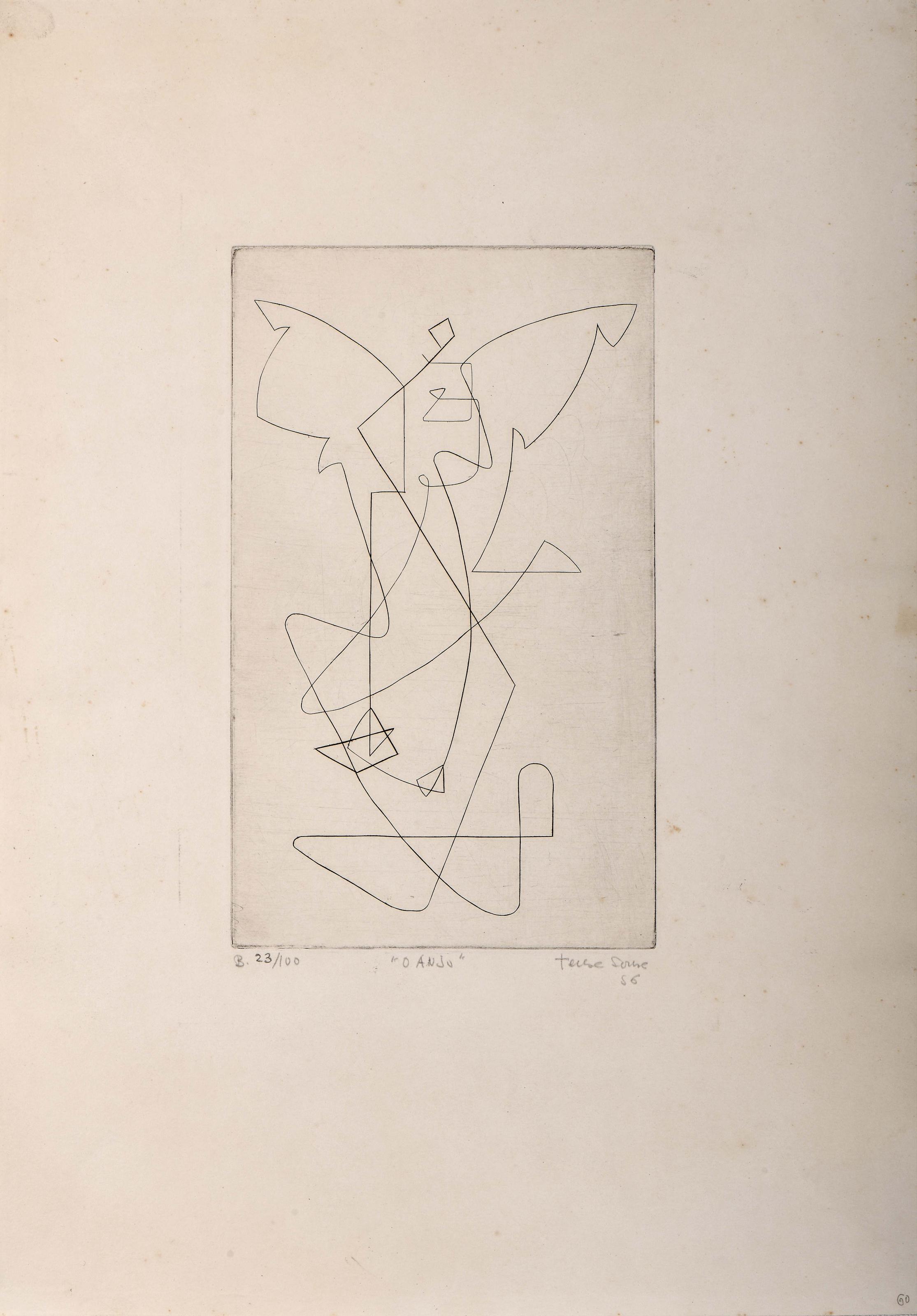 TERESA SOUSA - 1928-1962 "O Anjo" gravura a buril sobre cobre estampada em papel assinada e datada de 1956, numerada 23/100 Dimensões (altura x comprimento x largura) - (mancha) 26,3 x 15,9 cm; (papel) 50 x 35 cm Notas: Apesar da sua formação académica em Pintura, Teresa Sousa descobriu em Paris, por recomendação de Vieira da Silva, a sua vocação para a gravura. Entre 1955 e 1956 estudou com S. W. Hayter no célebre Atelier 17, experiência decisiva e inovadora numa época em que a gravura artística era pouco valorizada em Portugal.As suas primeiras obras de gravura, de 1956, em técnicas calcográficas (buril, água-forte e processo misto, este uma combinação de duas ou mais técnicas), revelam a influência de Hayter e do Atelier 17. Contudo, Teresa Sousa explorou também linoleogravura, litografia, xilogravura e serigrafia. A formação no Atelier 17 foi essencial para o seu reconhecimento como pioneira da gravura moderna portuguesa, consolidado com o prémio de gravura que lhe foi atribuído na I Exposição de Artes Plásticas da Fundação Calouste Gulbenkian, em 1957, apenas 2 anos após o início dos seus estudos de gravura no Atelier 17.Entre 1955 e 1961 foi uma artista prolífica e premiada, mas a morte precoce aos 33 anos acabados de fazer interrompeu uma carreira promissora. Deixou diversos trabalhos e estudos inacabados.Presentemente os filhos da artista estão a divulgar a obra da sua mãe e a tentar recolocar o seu nome no panorama das artes plásticas em Portugal, tendo até agora conseguido promover a realização de cinco exposições: “(Re)Descobrir Teresa Sousa. Gravura – 60 anos depois” - Biblioteca Nacional de Portugal, 07-11-2022 a 25-02-2023, e Biblioteca Pública de Évora, 15-04-2023 a 20-05-2023; “Teresa Sousa – fragmentos de um breve percurso” - Centro UNESCO, Beja, 08-11-2023 a 29-12-2023; “Teresa Sousa (1928-1962) – Biografia Ilustrada” - Galeria Municipal do Onze, Setúbal, 03-02-2024 a 09-03-2024; e “Continuar a (re)descobrir Teresa Sousa (1928-1962)” - Galeria Municipal TREM - Manuel Baptista, Faro, 12 de Julho a 11 de Outubro de 2025.