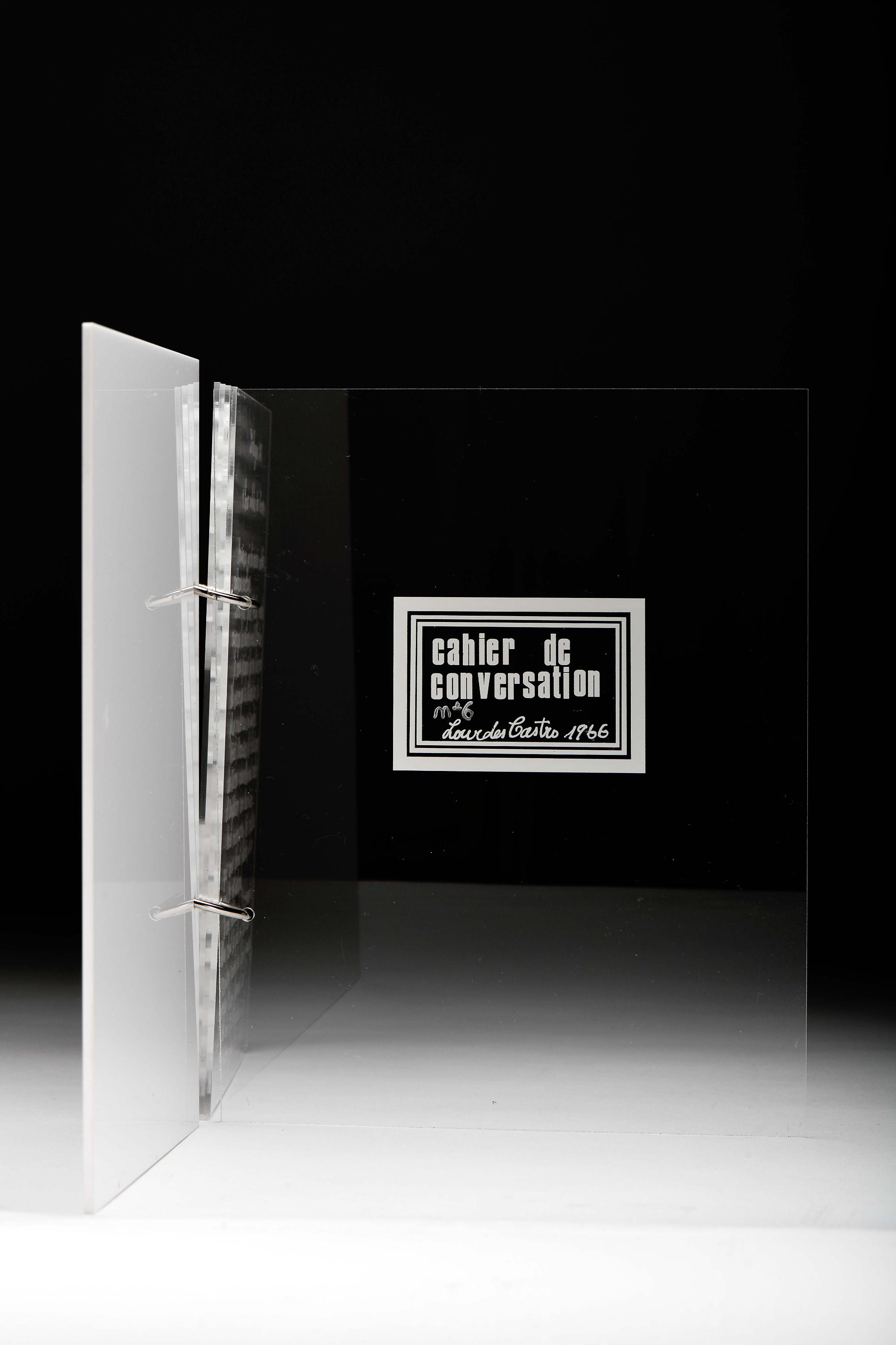 LOURDES DE CASTRO - 1930-2022 "Cahier de conversation (nº6), pour acheter des livres" - livro de artista em plexiglas - capa, contracapa e 5 folhas encadernadas com duas argolas metálicas com transcrição de um excerto de "Le nouveau guide de la conversation en Portugais et Français, publié à Paris chez Boblé et Hingray, en 1827" assinado e numerado 16/25 no verso, edição de Lourdes de Castro et Éditions rue Visconti de 25 exemplares + 5 HC, Maio 2014 Dimensões (altura x comprimento x largura) - 26 x 21 cm Notas: segundo informação no verso, o original da obra (exemplar único) foi realizado em 1966.