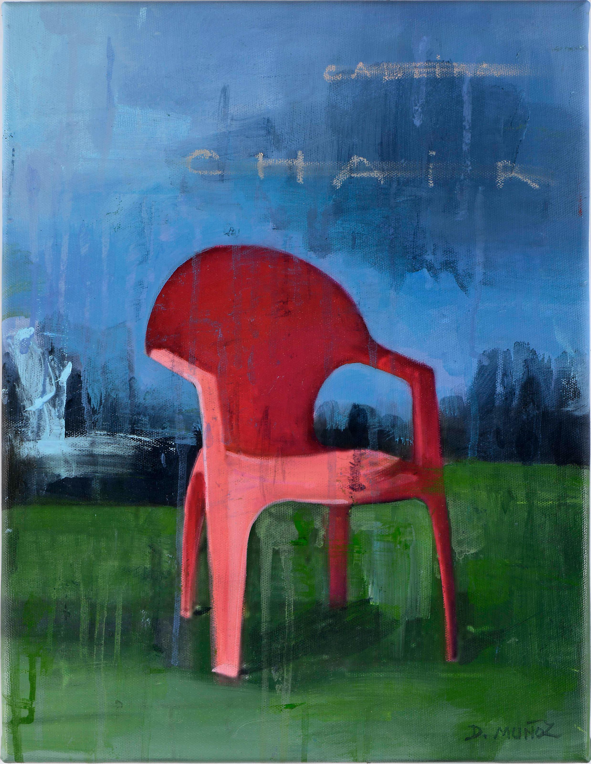 DIOGO MUÑOZ - NASC. 1973 "Cadeira vermelha" acrílico sobre tela assinado Dimensões (altura x comprimento x largura) - 40 x 30 cm Notas: Diogo Muñoz (Lisboa - 1973). O universo pictórico de Diogo Muñoz é um território de memória e imaginação, onde se cruzam referências históricas, culturais e pessoais. As suas obras articulam o real e o simbólico, o íntimo e o colectivo, transformando imagens conhecidas em novas leituras visuais. Nos últimos anos, aprofundou uma investigação plástica que integra elementos da cultura popular e da história da arte, num diálogo entre o passado e o presente.