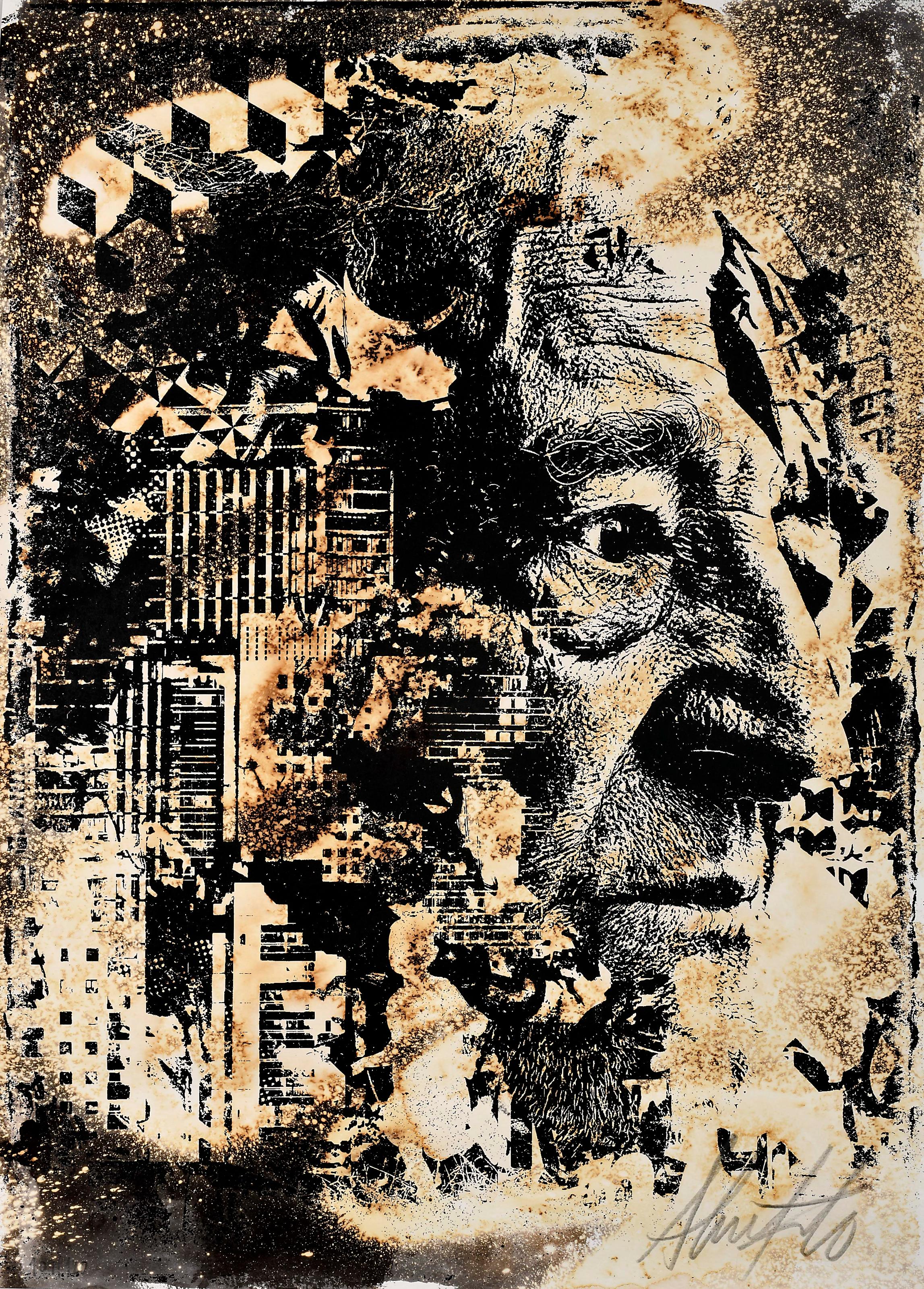 ALEXANDRE FARTO AKA VHILS - NASC. 1987 "Node", 2023 screen print sobre papel Astropack Avorio 280 g/m2 tinta de screen print, tinta Quink, lixívia e ácido terminado à mão assinado, numerado 109/120, edição de 120 exemplares + 15 AP + 15 HC Dimensões (altura x comprimento x largura) - 70 x 50 cm Notas: Alexandre Farto (Lisboa, 1987), conhecido artisticamente como Vhils, iniciou o seu percurso no início dos anos 2000 como writer de graffiti. Cresceu no Seixal, onde foi marcado pelo intenso processo de urbanização das décadas de 1980 e 1990, desenvolvendo um olhar atento sobre as marcas que a cidade e os seus muros guardam das transformações sociais e históricas.A sua prática, descrita como uma poesia visual brutal e delicada, reflete sobre identidade, urbanidade e a erosão da singularidade cultural perante a globalização. Escavando camadas de materiais e memórias esquecidas, Vhils revela tensões entre destruição e beleza, apagamento e resistência.Recorrendo a técnicas e ferramentas pouco convencionais, o artista criou uma linguagem visual única que atravessa diversos suportes — da escultura em baixo-relevo em paredes ao metal, madeira, vídeo, instalação e arte digital. O seu trabalho já foi apresentado em instituições de referência como o MAAT (Lisboa), Palais de Tokyo (Paris), Barbican Centre (Londres), Museum of Contemporary Art San Diego, CAFA Art Museum (Pequim) e Le Centquatre (Paris), entre outras.