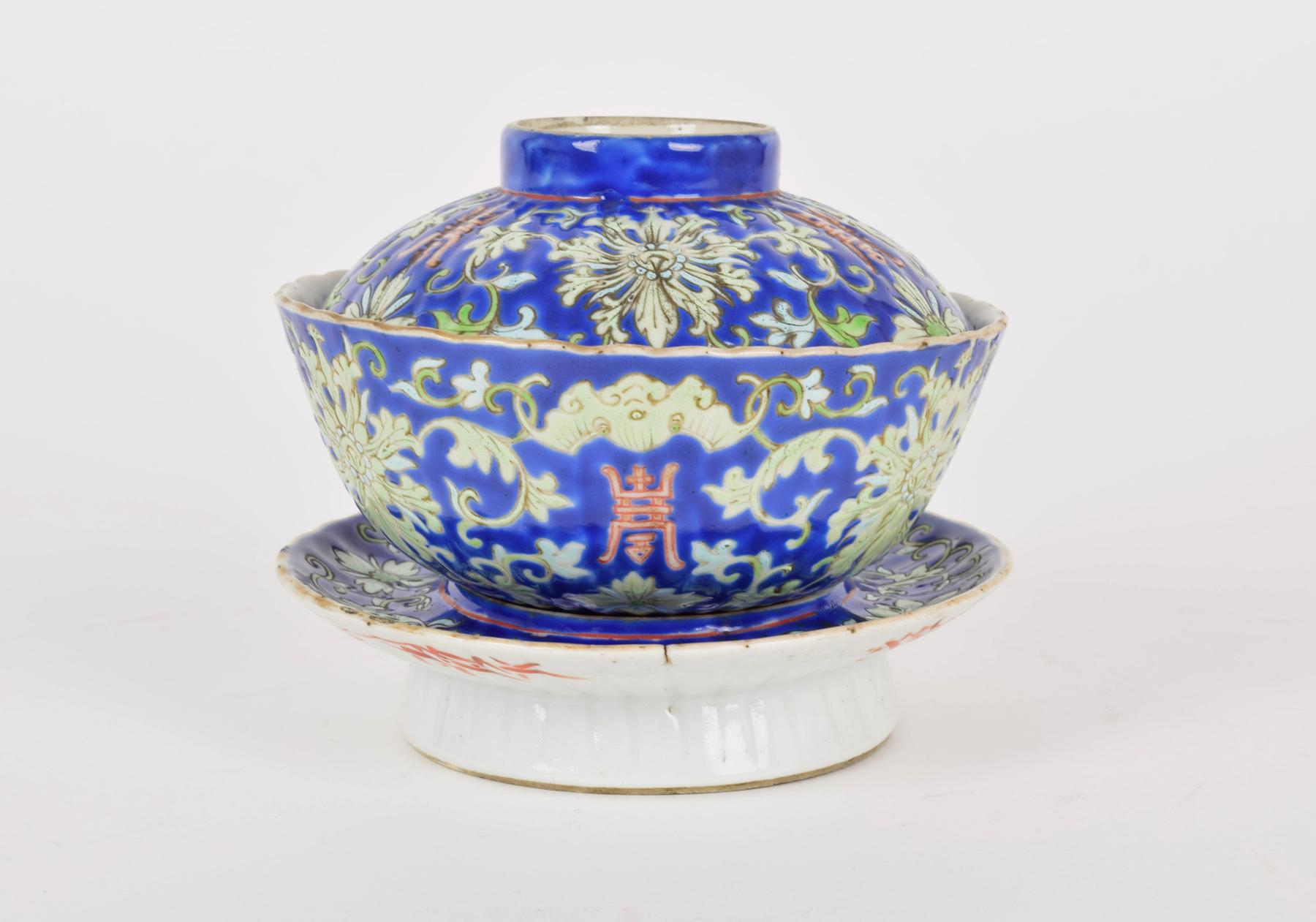 Taça com aro e tampa porcelana chinesa de exportação decoração gomada e policromada e dourada sobre fundo azul "Flores e caracteres chineses" reinado Tongzhi (1862-1874) cabelo na taça marcada Dimensões (altura x comprimento x largura) - 9,5 x 12,5 cm
