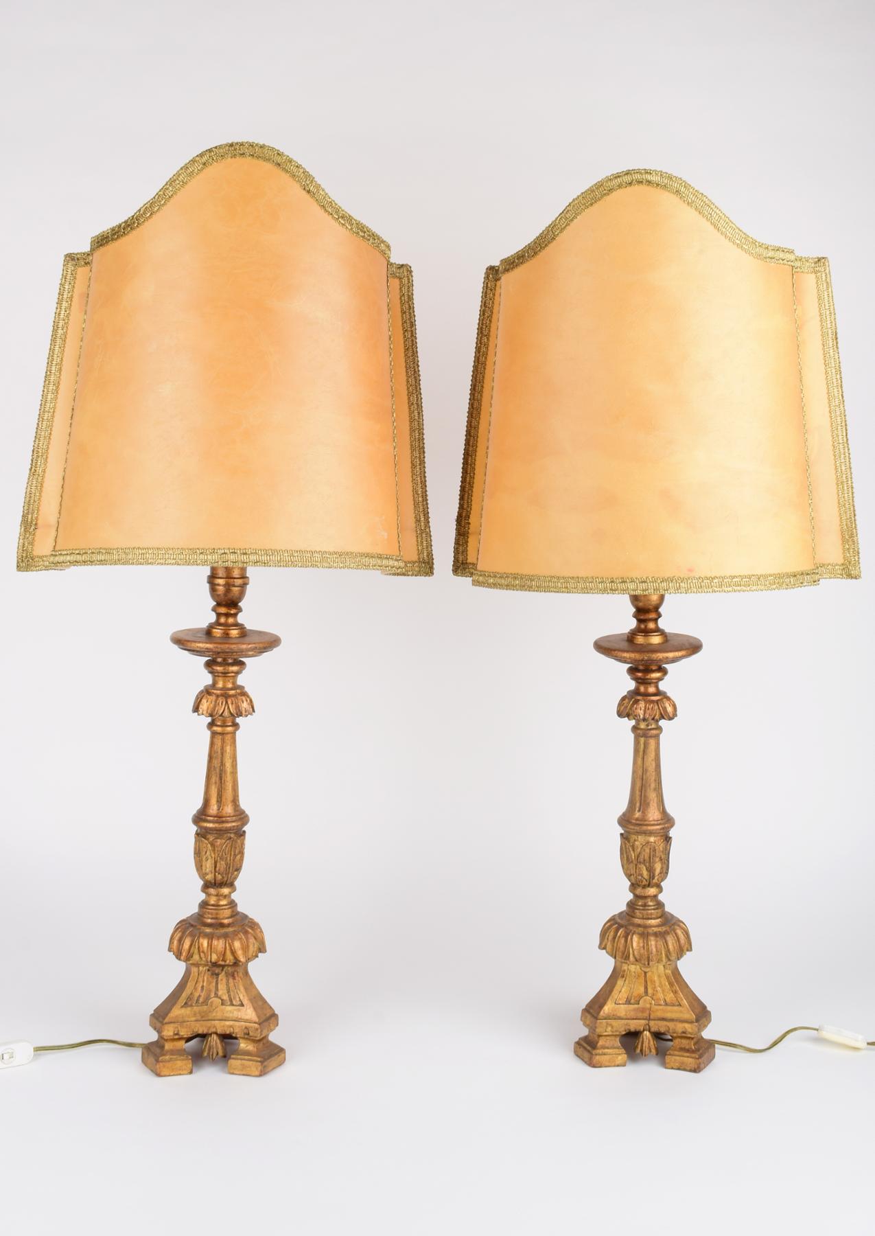 Par de tocheiros estilo D. Maria madeira entalhada e dourada abat-jours em tecido portugueses séc. XX electrificados, pequenos defeitos Dimensões (altura x comprimento x largura) - 95 cm