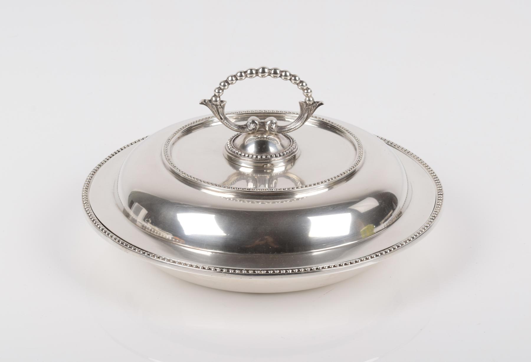 Prato coberto redondo prata de 833/1000 frisos perlados português contraste Águia do Porto (1938-1984) (Vidal - 49) Dimensões (altura x comprimento x largura) - 12,5 x 24 cm; Peso - 1146 g.