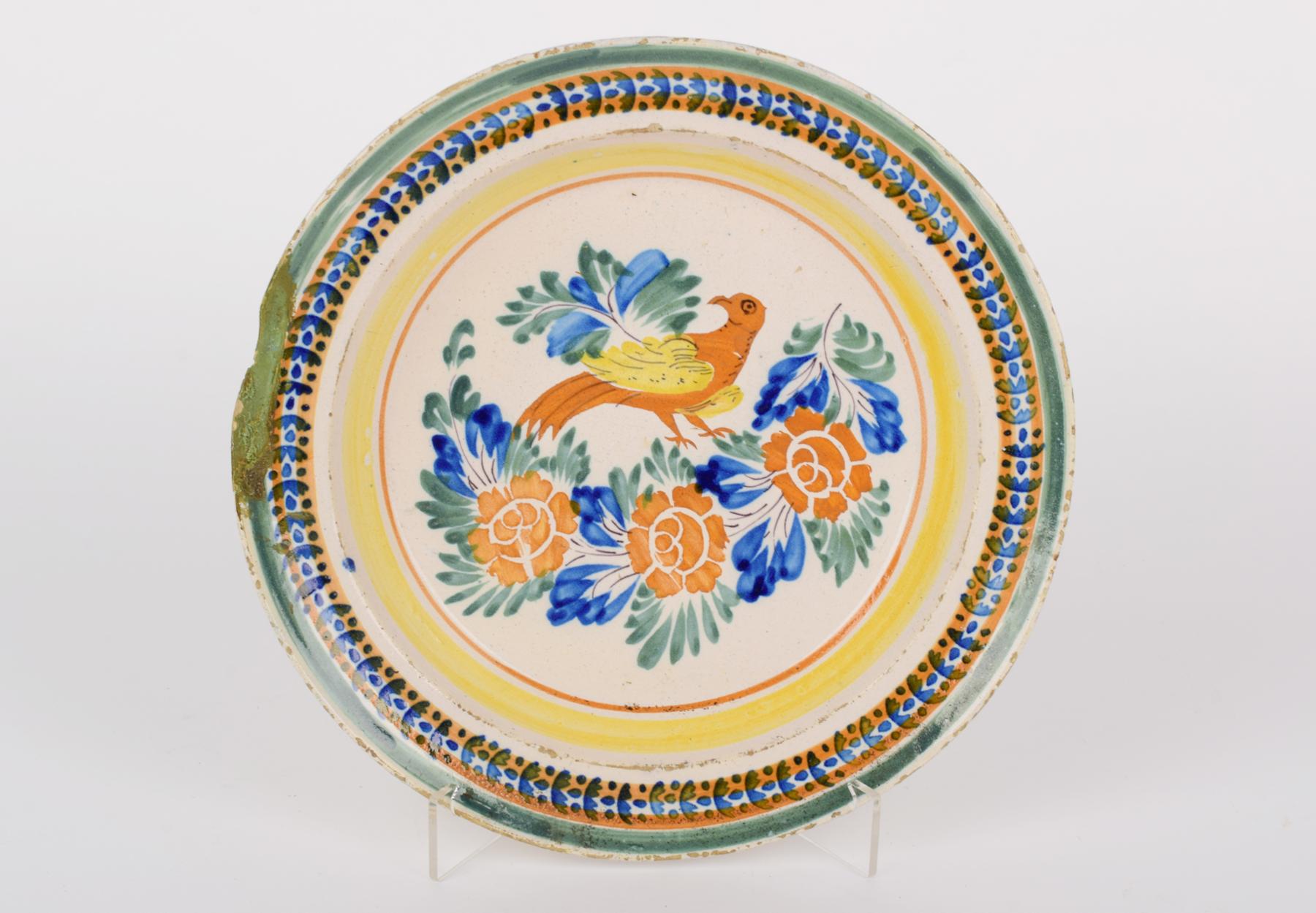 Prato faiança decoração policromada "Pássaro e flores" português séc. XIX grande falta no bordo, pequenas faltas no vidrado Dimensões (altura x comprimento x largura) - 31,5 cm